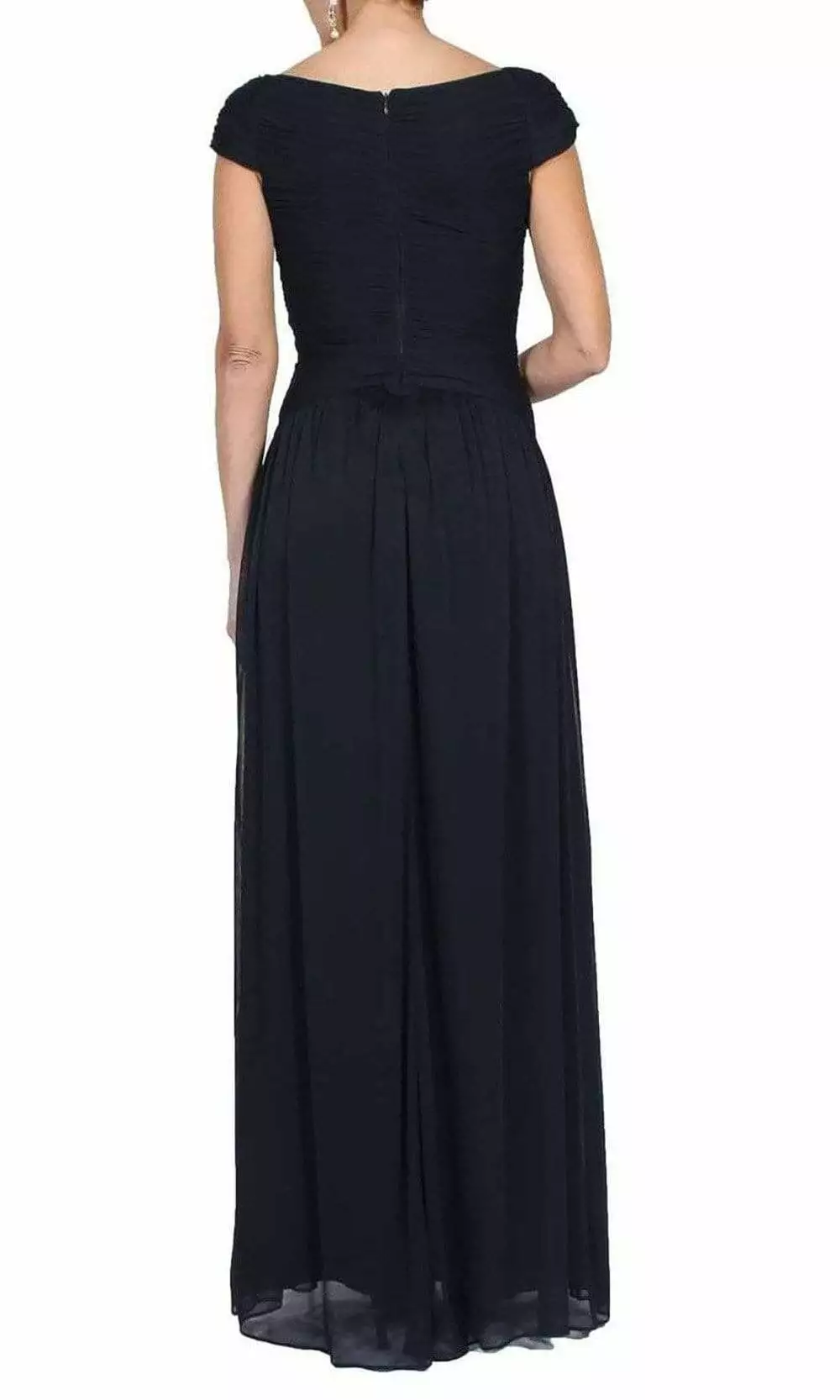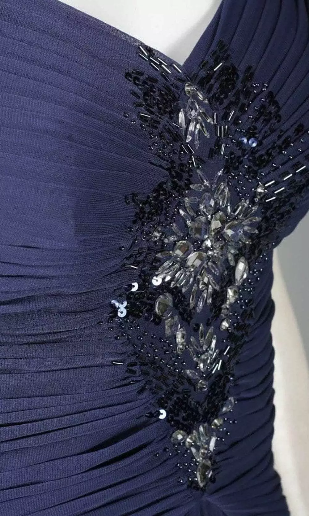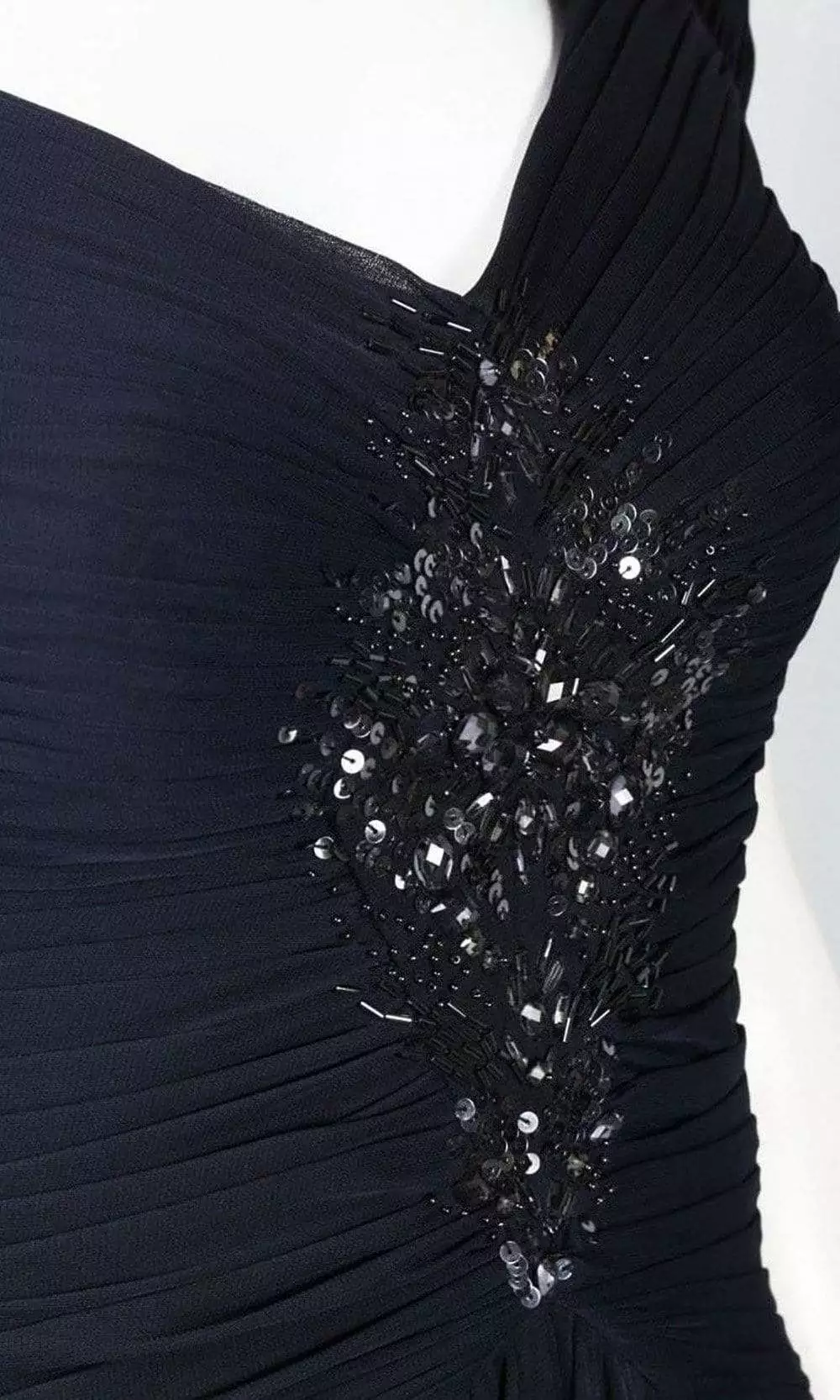 | Details: | Cap Sleeve, Ruched Bodice, Beaded Details, Jersey, Mesh, Full Length Hem |