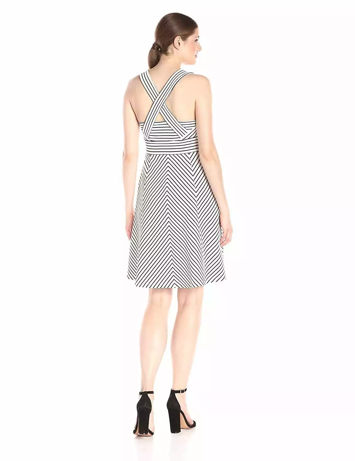 | Details: | Ottoman knit fabric, Sleeveless, Cross back straps, Banded waist, Fit and flare, Side zipper closure |
