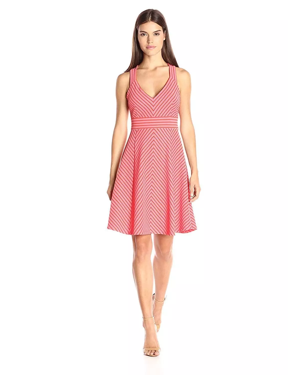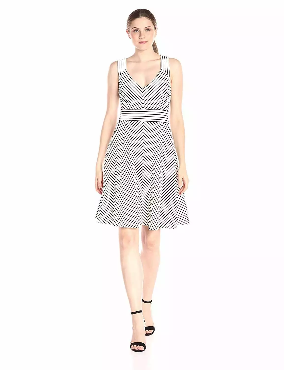 Draw attention in this chevron striped sundress by Adrianna Papell 12255150. This fit and flare dress is tailored in finely ribbed ottoman fabric, charms in sleeveless, V neckline with tapered straps leading to the crisscrossed back and features self-fabric band highlighting the natural waist. This Adrianna Pape style is perfect option for your next day out.