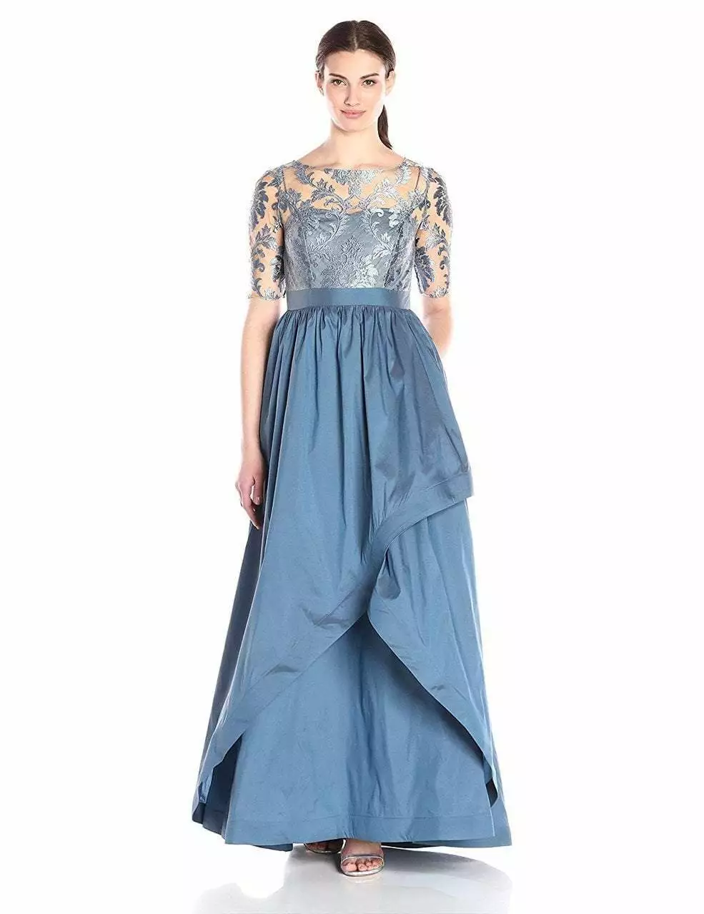 Expect to be turning heads as you walk into your special event wearing this creatively romantic dress by Adrianna Papell 81920870. The dress features sheer quarter length sleeves with an illusion bateau neckline. The bodice is embellished with lace appliques. The sweetheart lined bodice is cinched in a waistband. The back has a charming keyhole and a zipper closure. Completing the look is an asymmetric full length A-line skirt. This Adrianna Papell creation will sure to display your natural beauty and grace. Model is wearing Dusty Blue color.