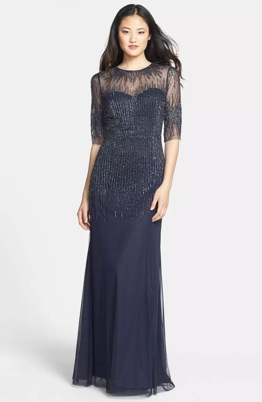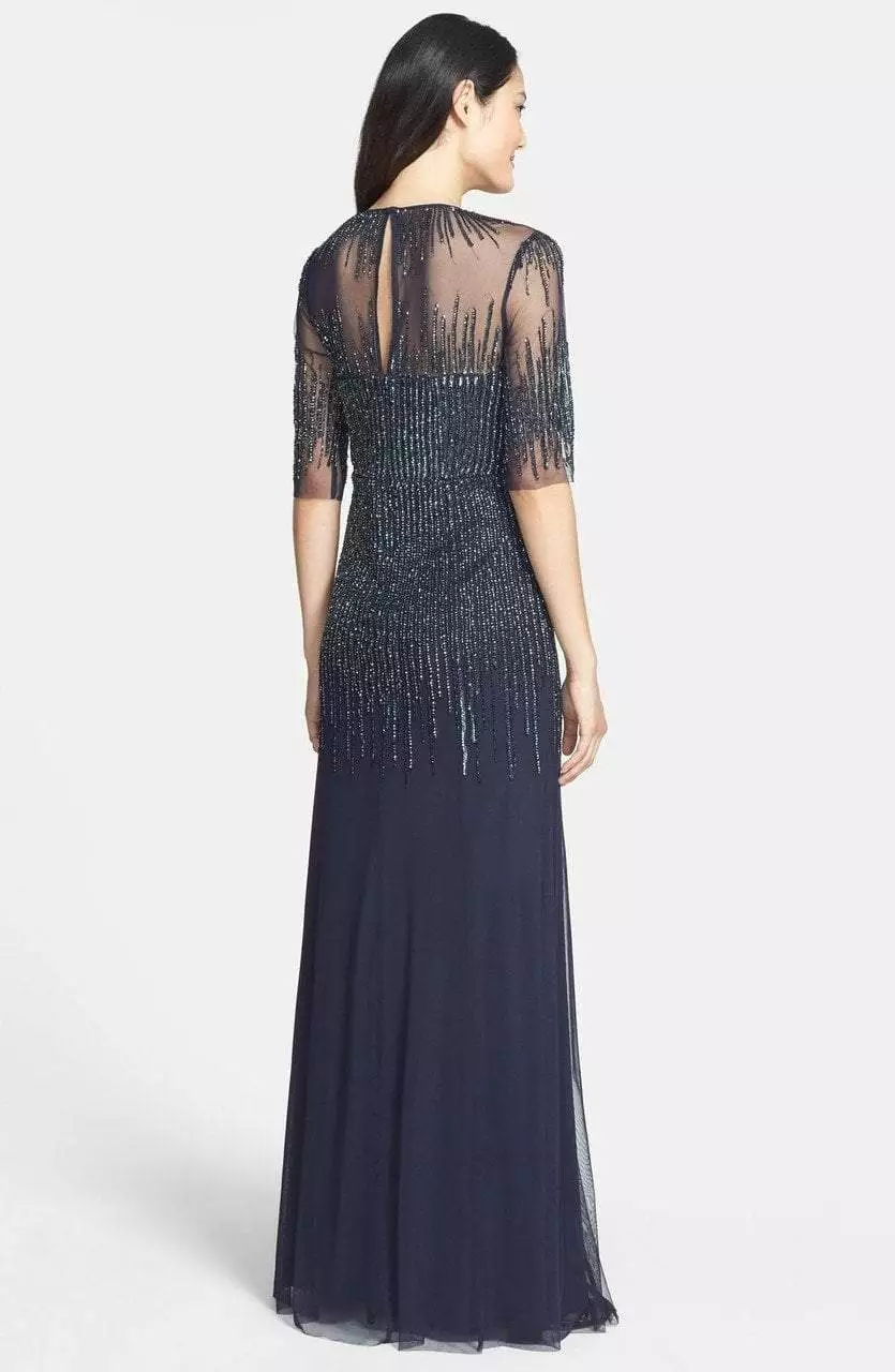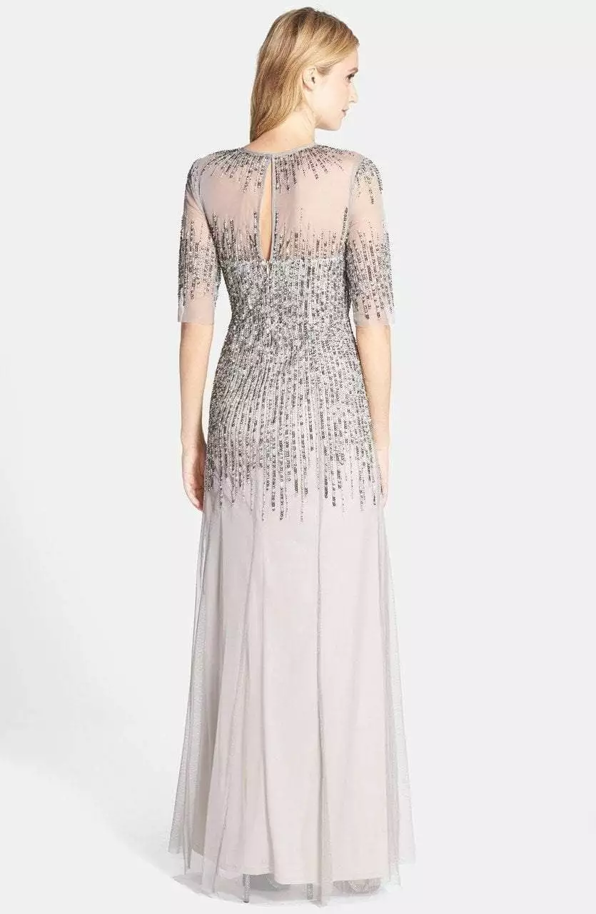 Appear as ostentatious as you can be in this glamorously embellished Adrianna Papell 91896950 creation. Trailing with tonal sequins and beads that shimmers all night, this charming piece flaunts an illusion jewel over a pronounced sweetheart neckline framed with sheer quarter sleeves. Dripping with rivulets, this ensemble presents a keyhole cutout on its diaphanous back. The sheath skirt cascades with mesmerizing rivulets as it brushes the floor with a full-length hemline. Look amazingly wonderful as you showcase a lavish style in this Adrianna Papell masterpiece.