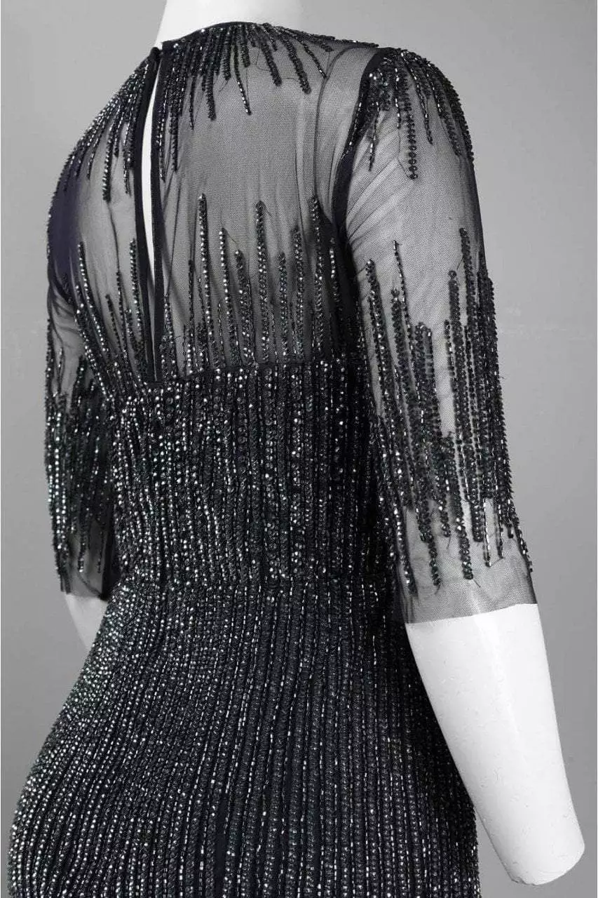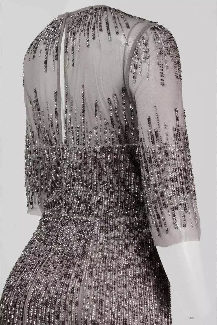 | Details: | Sequins, Illusion Quarter Sleeves, Keyhole Sheer Back, Mesh, Button, Back Zipper Closure, Full Length Hem |