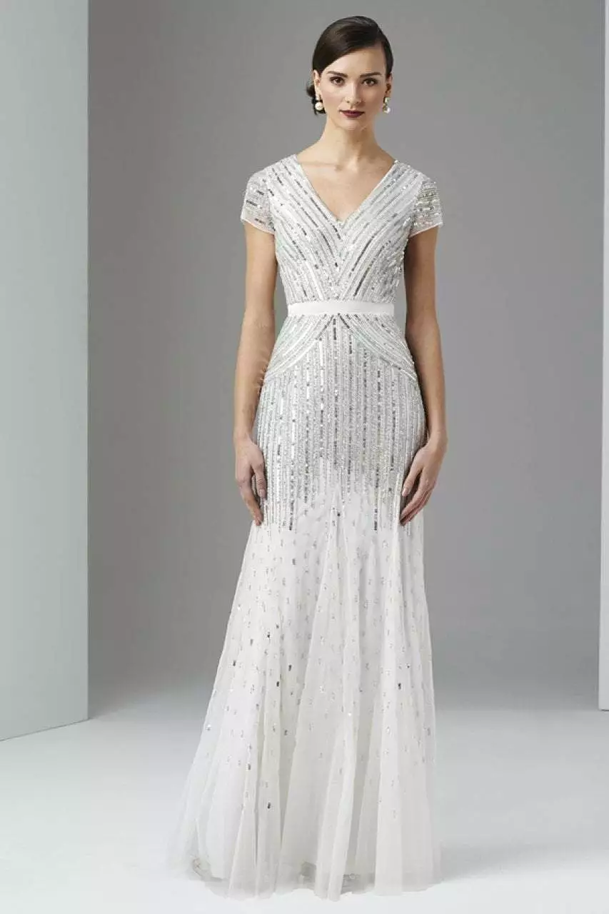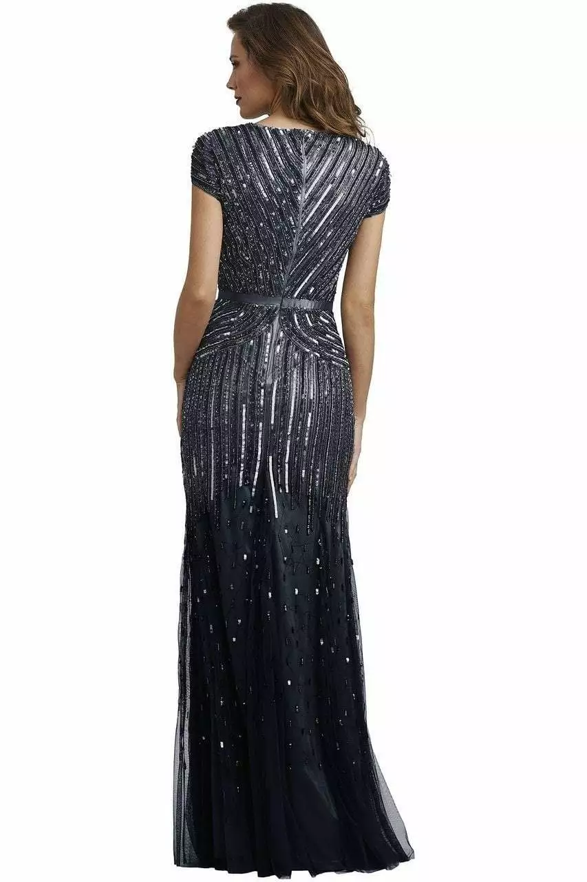 Make everyone stop and stare at your magnificence in this glorious Adrianna Papell 92868950 creation. Intricately embellished with glimmering sequins arranged in a striped trailing motif, this exceptional piece shows off a v-neckline framed with sheer cap sleeves and a full back. Nipped around the natural waist with an inset satin band, the A-line skirt cascades in a spectacle of shimmer as it subtly flares down to brush the floor at a full-length hemline. Make them swoon when you walk in style in this spectacular Adrianna Papell masterpiece. Models are wearing the Gunmetal, Champagne and White colors.