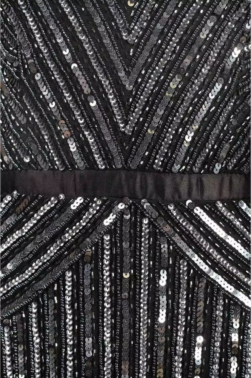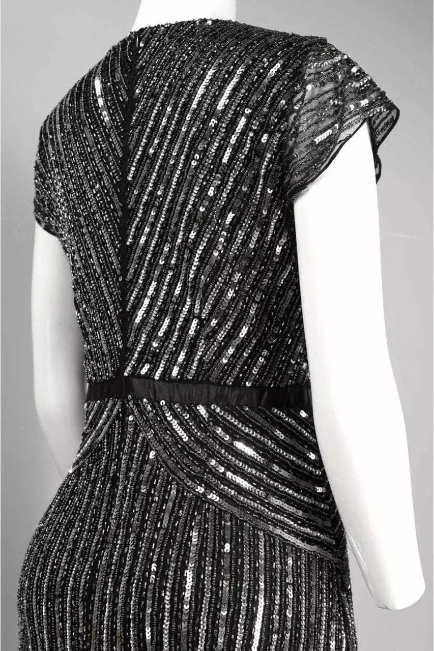 | Details: | Mesh, Cap Sleeves, Sequined, Full Back, Back Zipper Closure, Inset Waistband, Full-Length Hem |