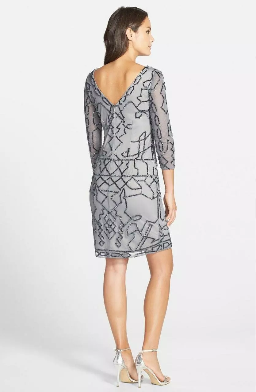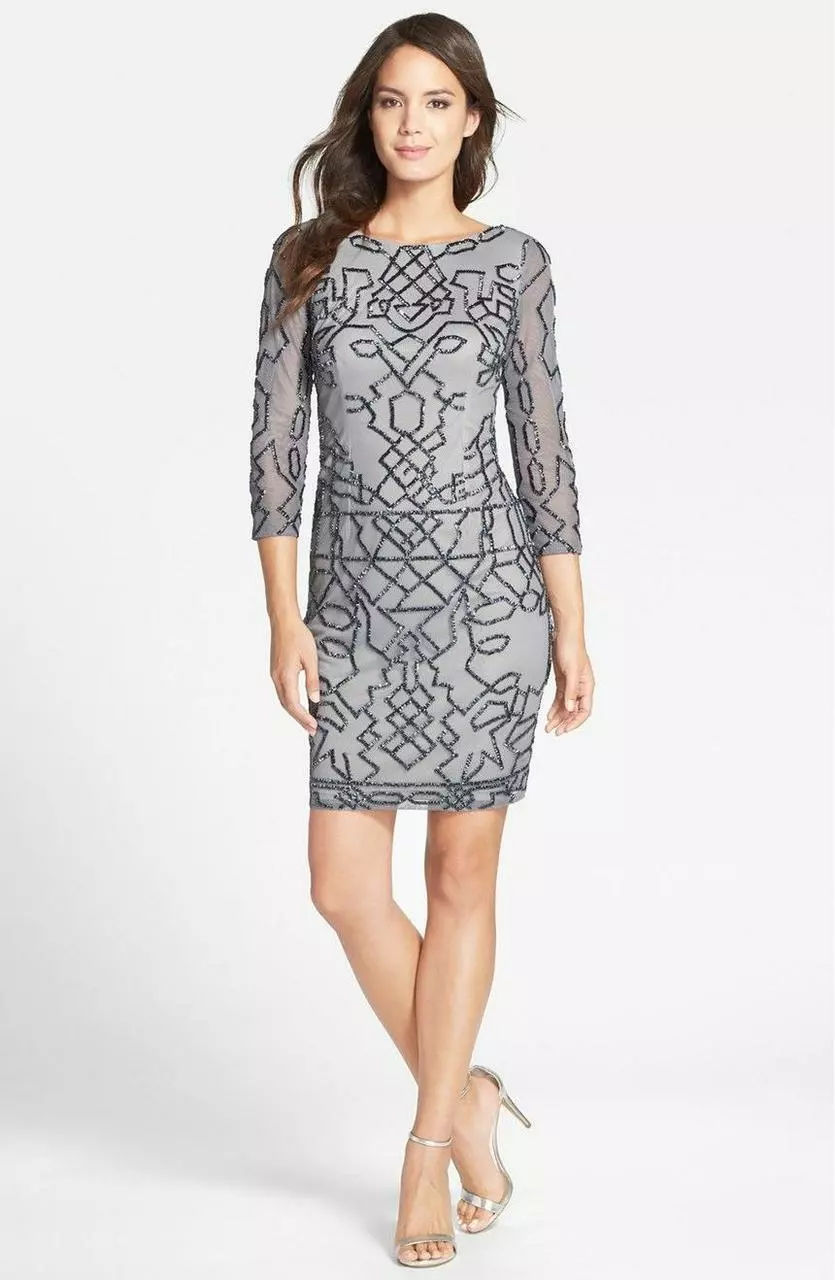 Flaunt your preference for the artistic while you showcase your finest assets in this ornate Adrianna Papell 41911010 creation. Tailored with a mesh fabric embellished with a stunning abstract beadwork on its entire silhouette, this beautiful piece presents a bateau neckline, quarter sleeves and a v-cut back. Molding with polish, the sheath skirt falls down to a modest short hem. Be a vision to be desired after in this glamorous Adrianna Papell masterpiece. Model is wearing the Sterling color.