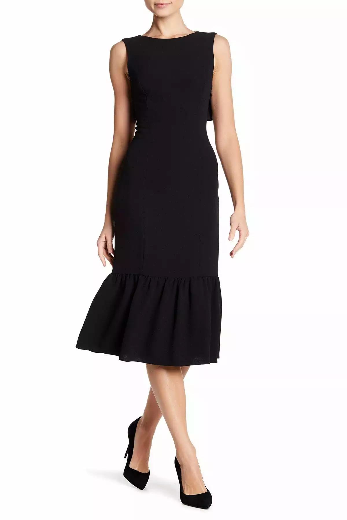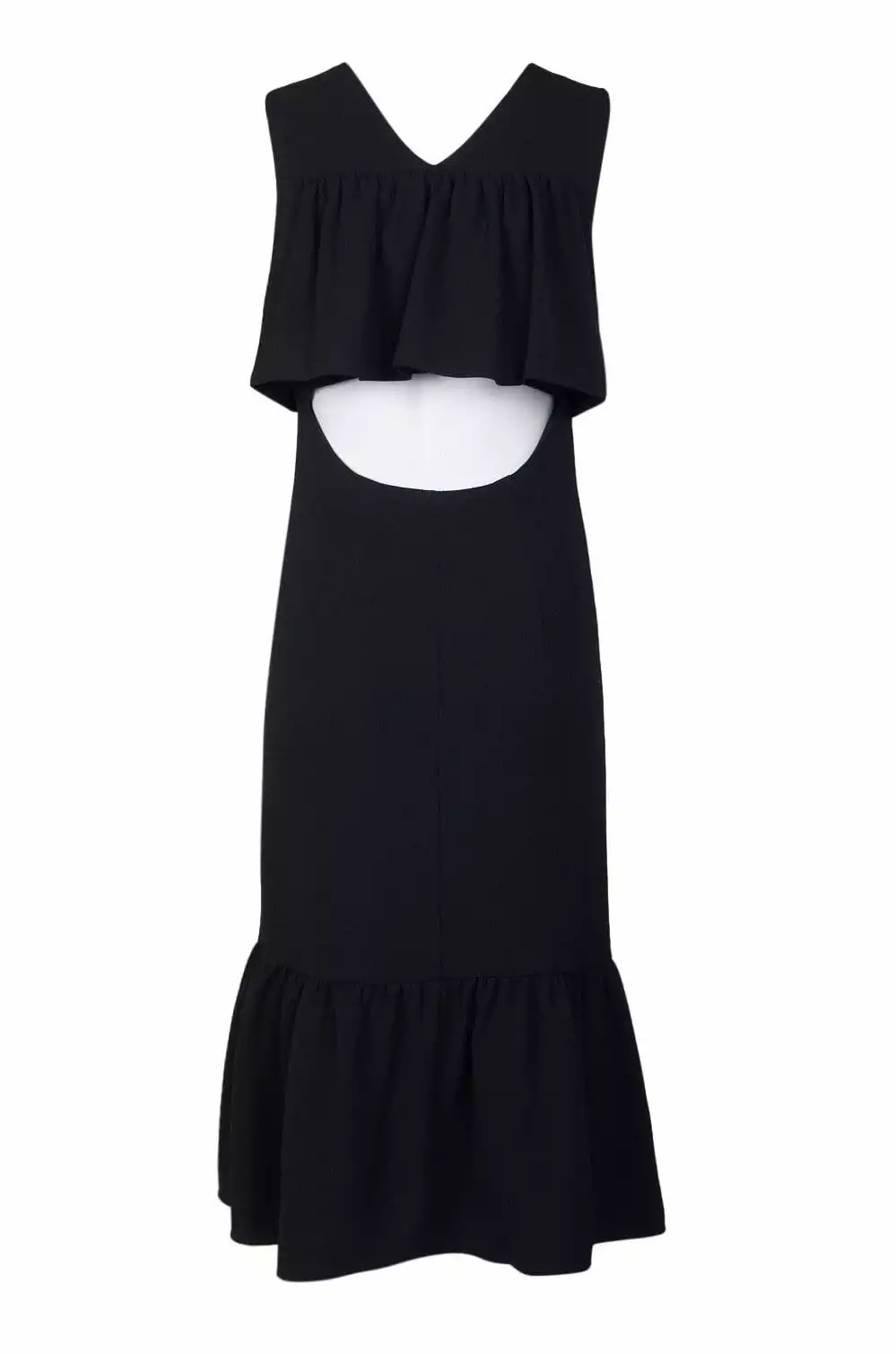 | Details: | Sleeveless, Cutout Back, Ruffle Accent, Ruffled Hem, Tea Length |