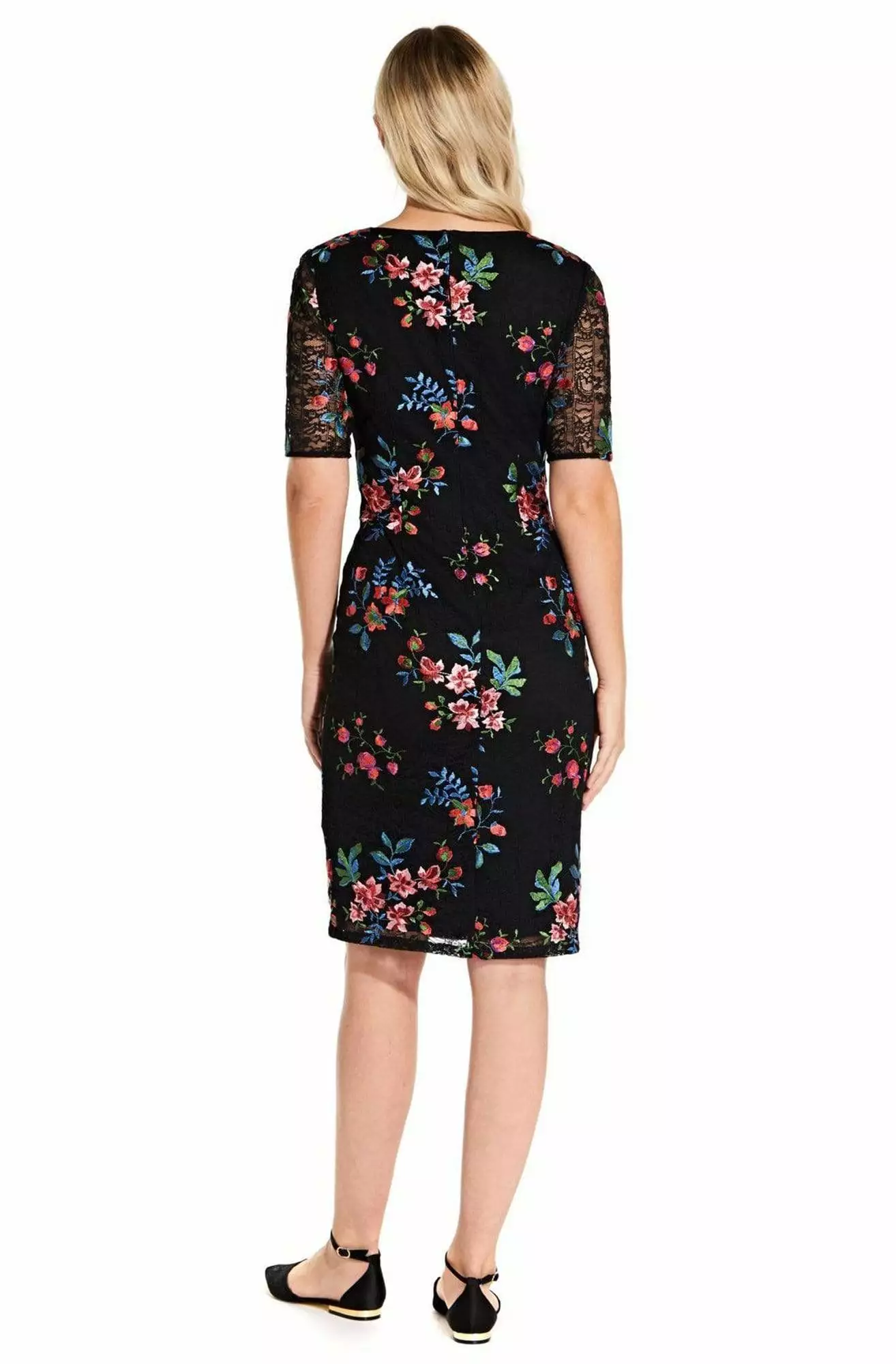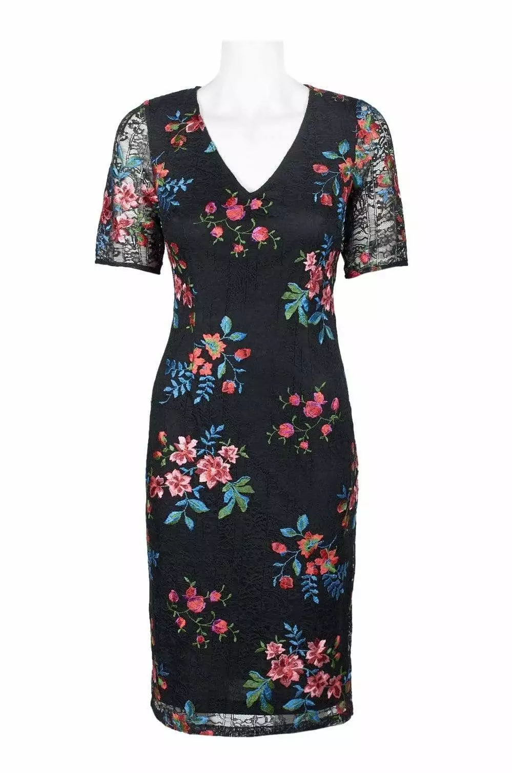 Sizzle all night in this fabulous look by Adrianna Papell AP1D102954. This floral embroidered dress showcases a V-neckline with short sleeves. The dress has a fitted bodice and the skirt forms a figure-flattering silhouette and runs at knee length hem. Demonstrate your svelte sense of style in this steamy formal by Adrianna Papell.