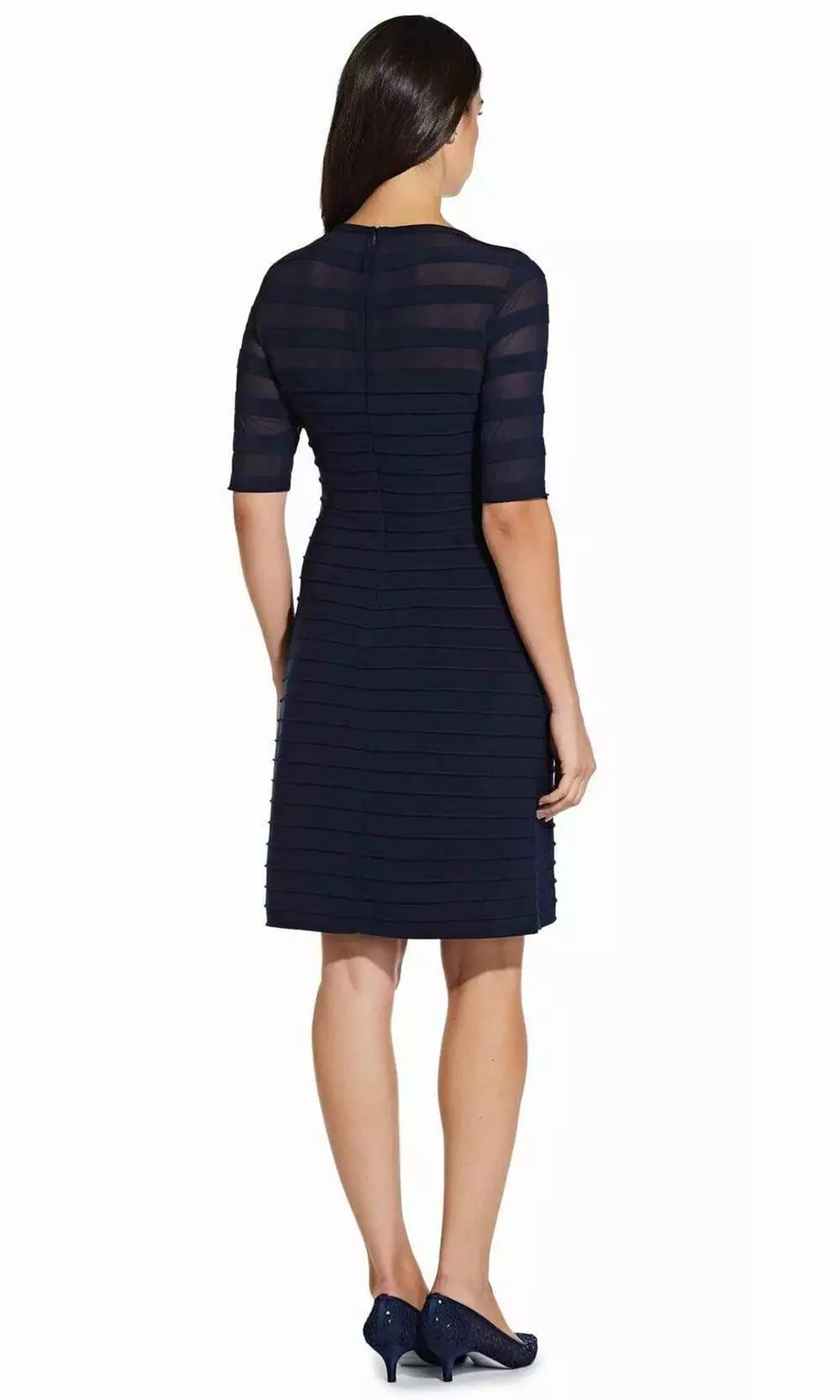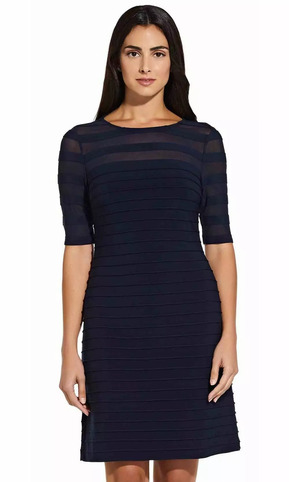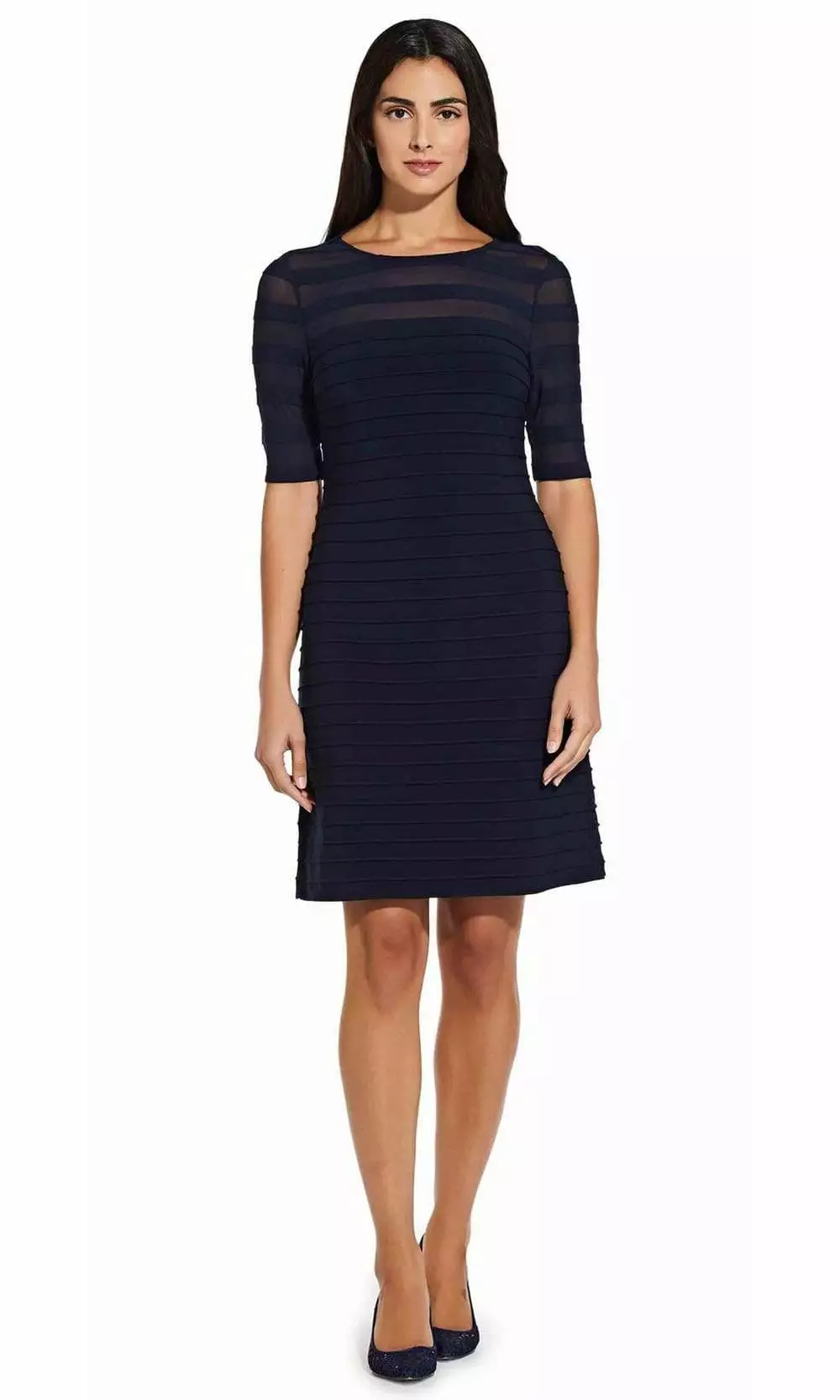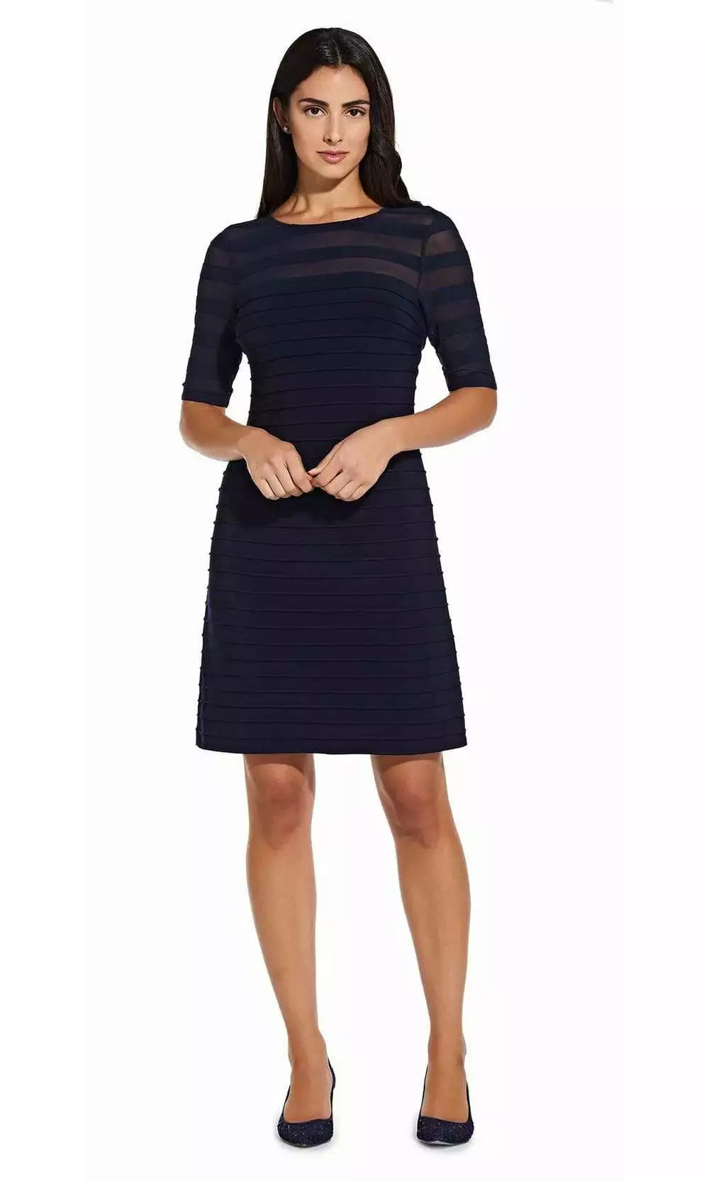 Look amazing for the party in this dress by Adrianna Papell AP1D103882. Made of jersey fabric, this ribbed cocktail dress features a bateau neckline with quarter length sleeves. It has a fitted bodice and a mid-thigh sheath skirt. Show your sophisticated sense of style in this Adrianna Papell dress.