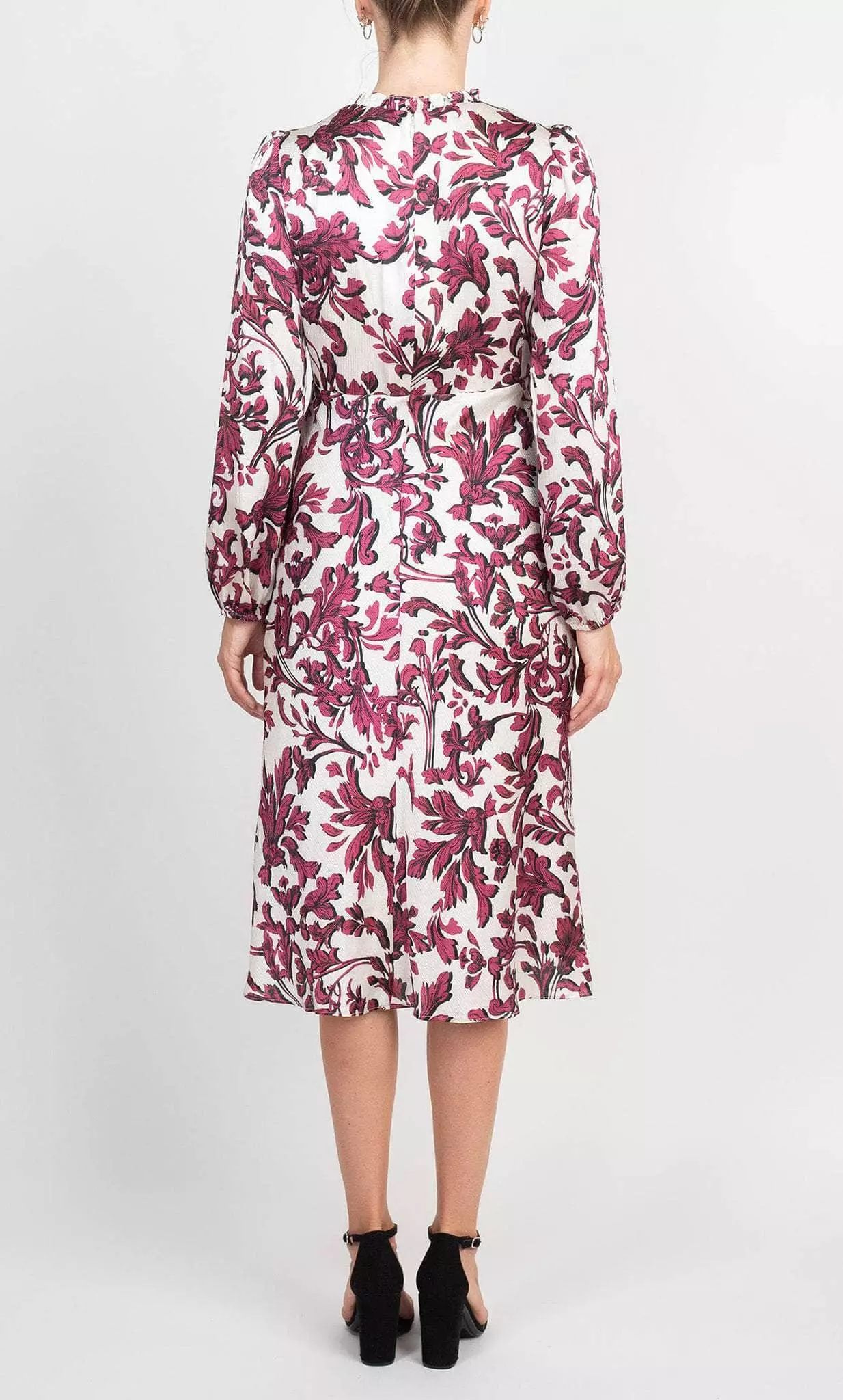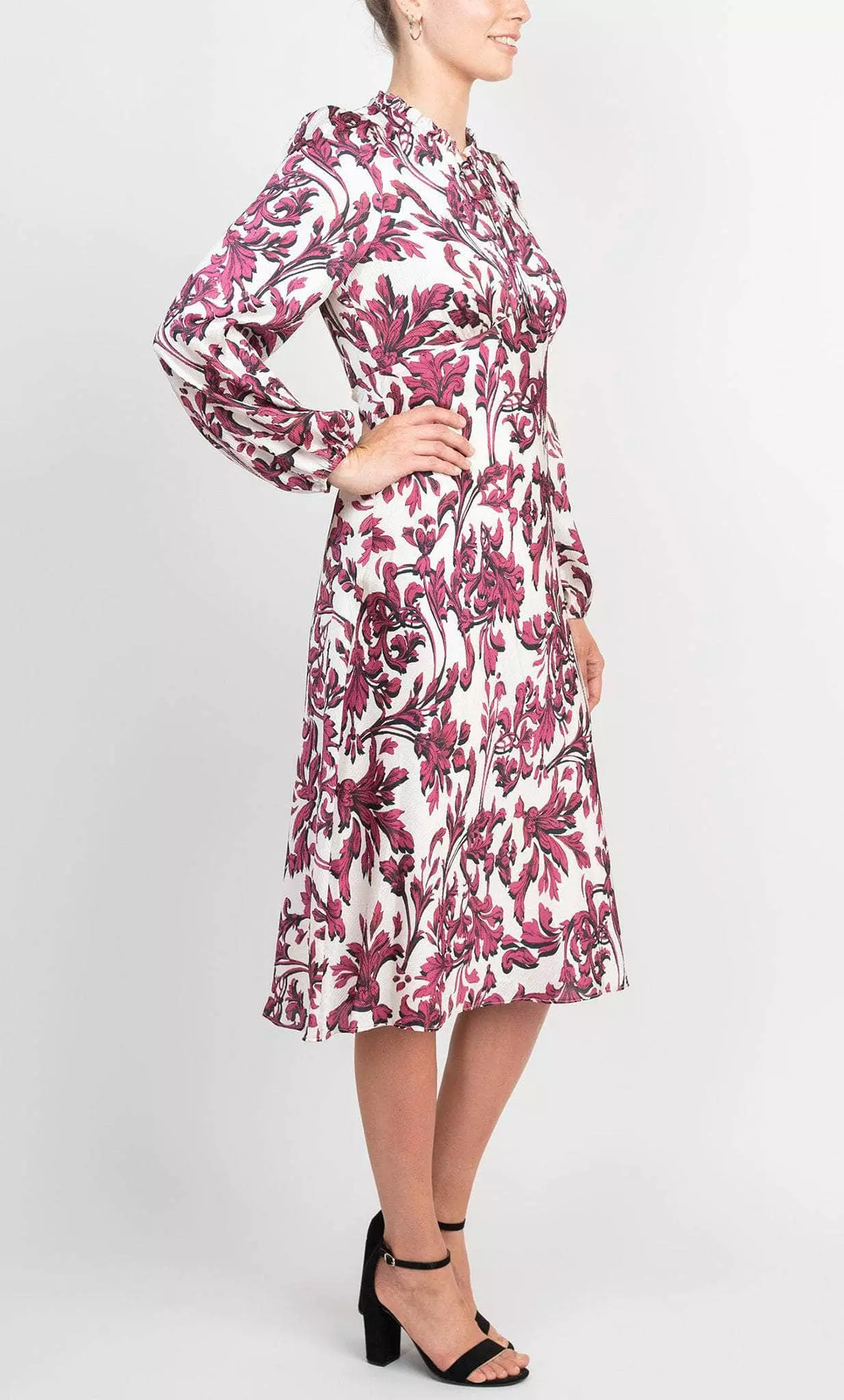 Strut your stuff in this head-turning piece by Adrianna Papell AP1D104268. Showcases a split V-neckline with a self-tie making it look more elegant. This floral printed dress is tailored from matte satin fabric. Framed with long sleeves and paired with a fully enclosed back that is secured with a back zipper closure. The skirt in this winning piece has a sheath silhouette and flares to a knee-length hemline. Get noticed in any crowd wearing this Adrianna Papell AP1D104268 creation. Model is wearing Burgundy White color.