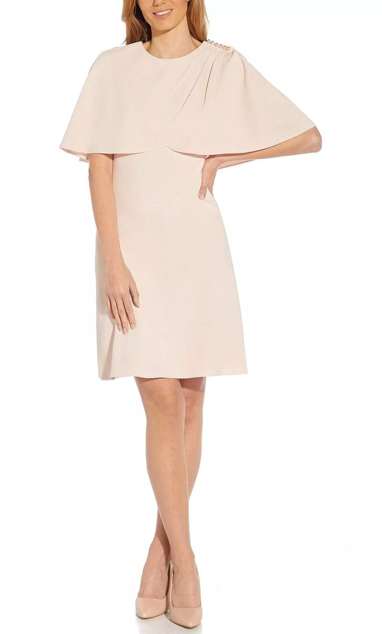 Expect to be turning heads as you walk into your special event wearing this creatively romantic dress by Immediate Apparel AP1D104636. When you wear this midi dress, you will exemplify elegance and attractiveness. It flaunts a cape sleeve that is mid-length and has a delicate A-line silhouette. At the shoulder, pearl accents are placed to draw attention. Utilizes a rear zipper to close. Unleash an inner glamour that attracts all eye on you in this Immediate Apparel AP1D104636. masterpiece. Model is wearing Blush color.