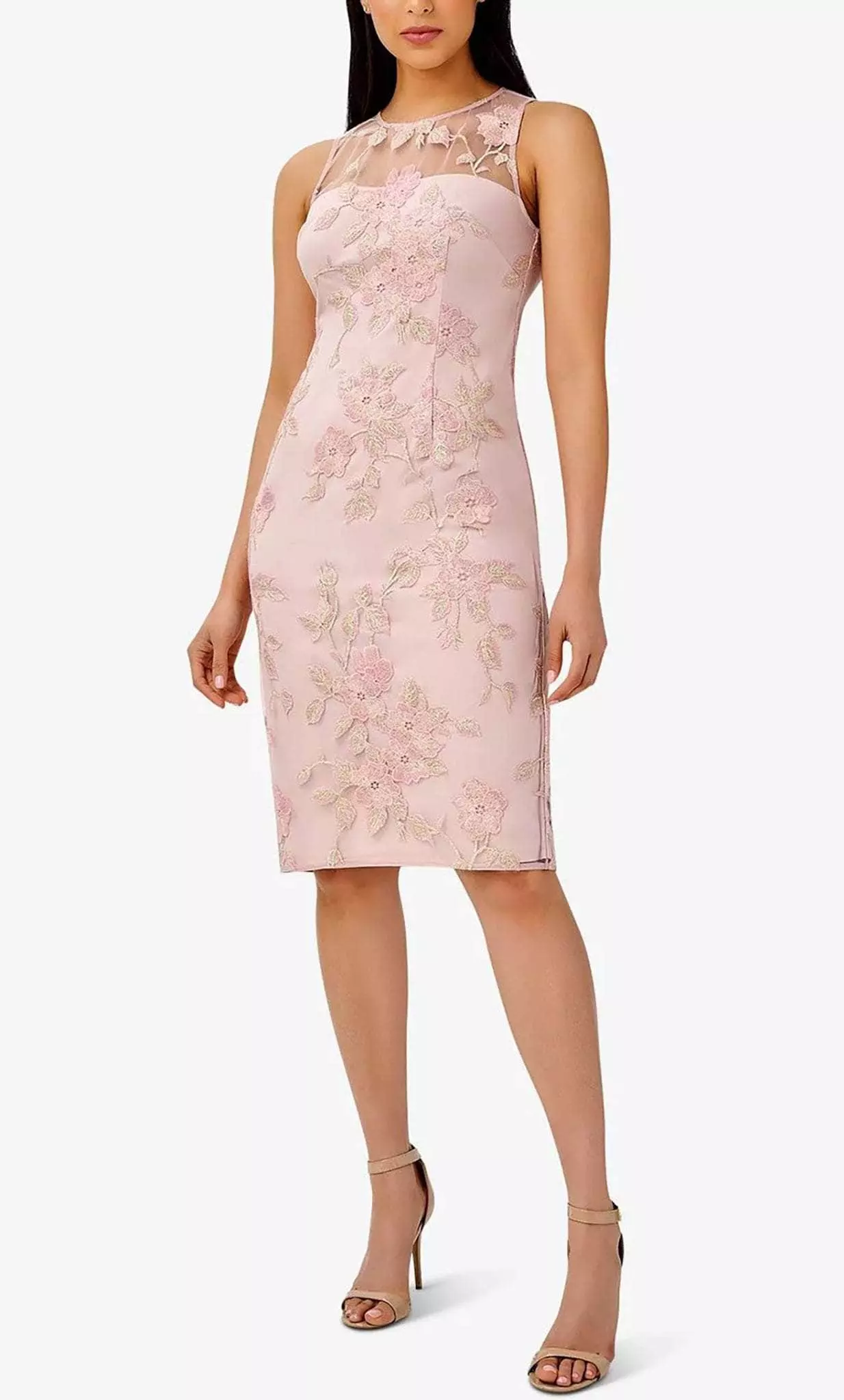 Fall for the very romance of this impeccably styled Adrianna Papell AP1D104769 dress. Gorgeously embellished with embroidered mesh all throughout. Everyone will turn heads when you passed by as this glamorous dress is revealed with an illusion jewel neckline and a sleeveless bodice. The skirt in a sheath silhouette ends in a mid-thigh hem for an elegant touch. Make such a stunning sight to behold in this Adrianna Papell AP1D104769 creation. Model is wearing Rose Gold color.