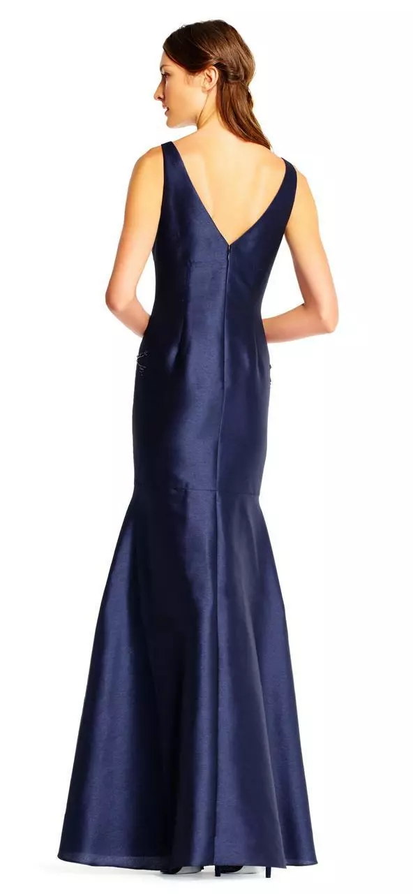Dress to impress on your next formal event in this simple but captivating dress from Adrianna Papell AP1E201575. This dress parades in a sleeveless, V-neckline bodice with embellishments on the sides. The slim fitting bodice has a V-shaped back and a zipper closure. Completing the look is a full length trumpet skirt. A sure winner from Adrianna Papell creation!