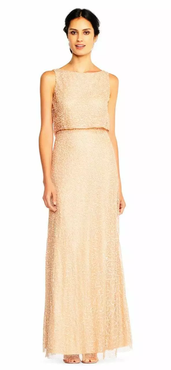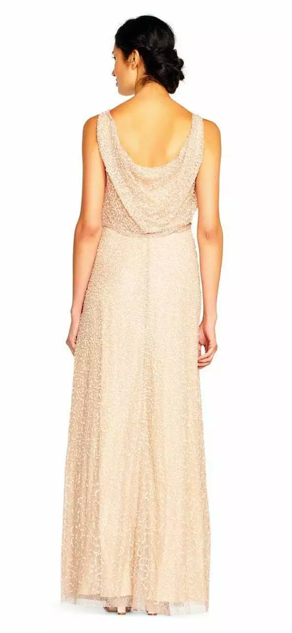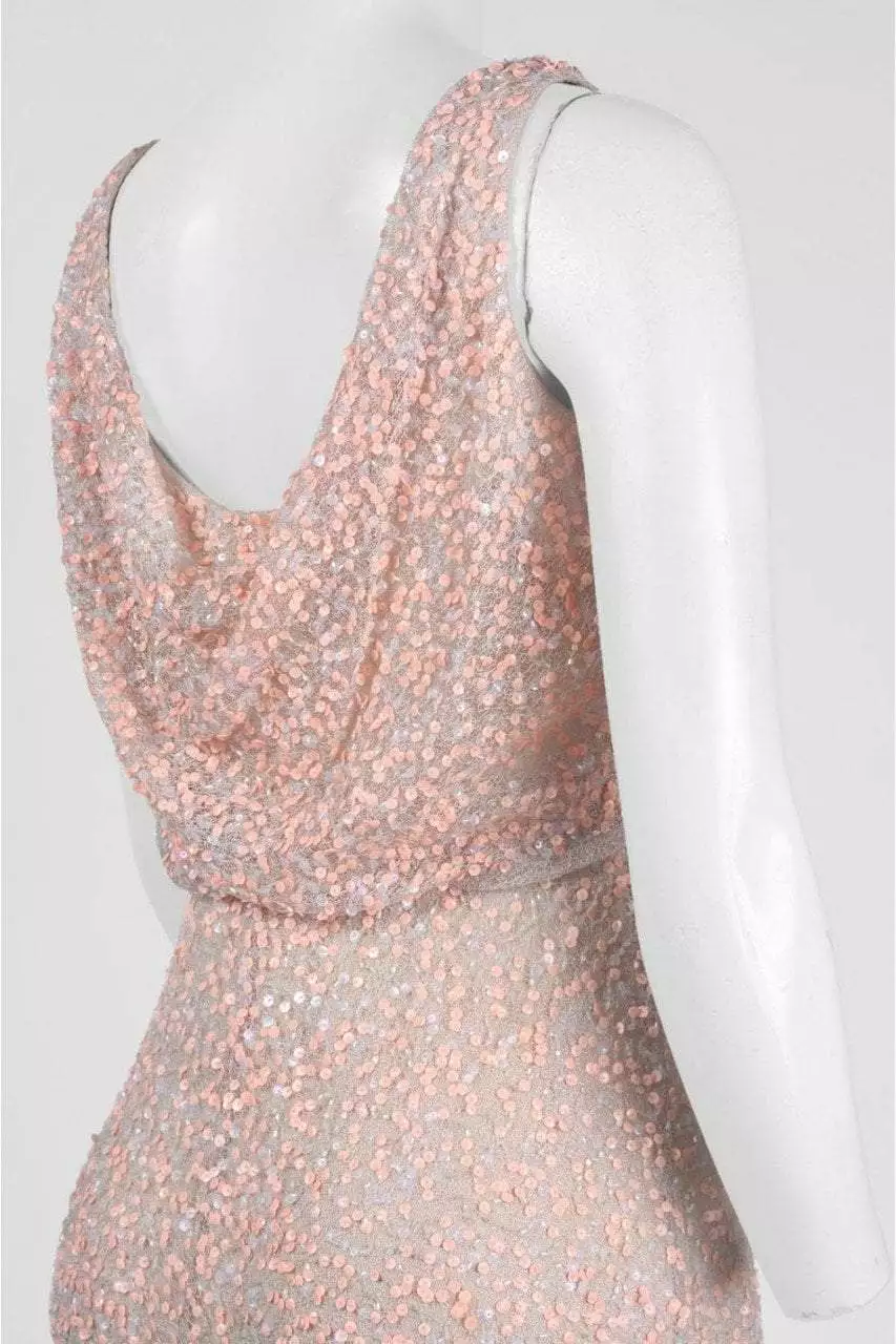 Promote attention-grabbing style in this stunning evening dress by Adrianna Papell AP1E201759. The sequined gown features a sleeveless bodice, bateau neckline, popover and cowl back. The skirt allows room to breath and dance but follows an elegant, straight line to the floor. The exquisite Adrianna Papell design gives you a classy and fabulous look for any special event.