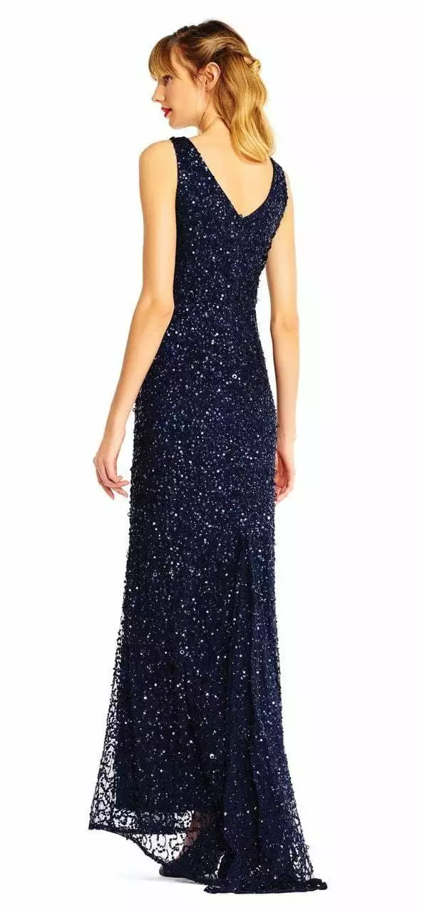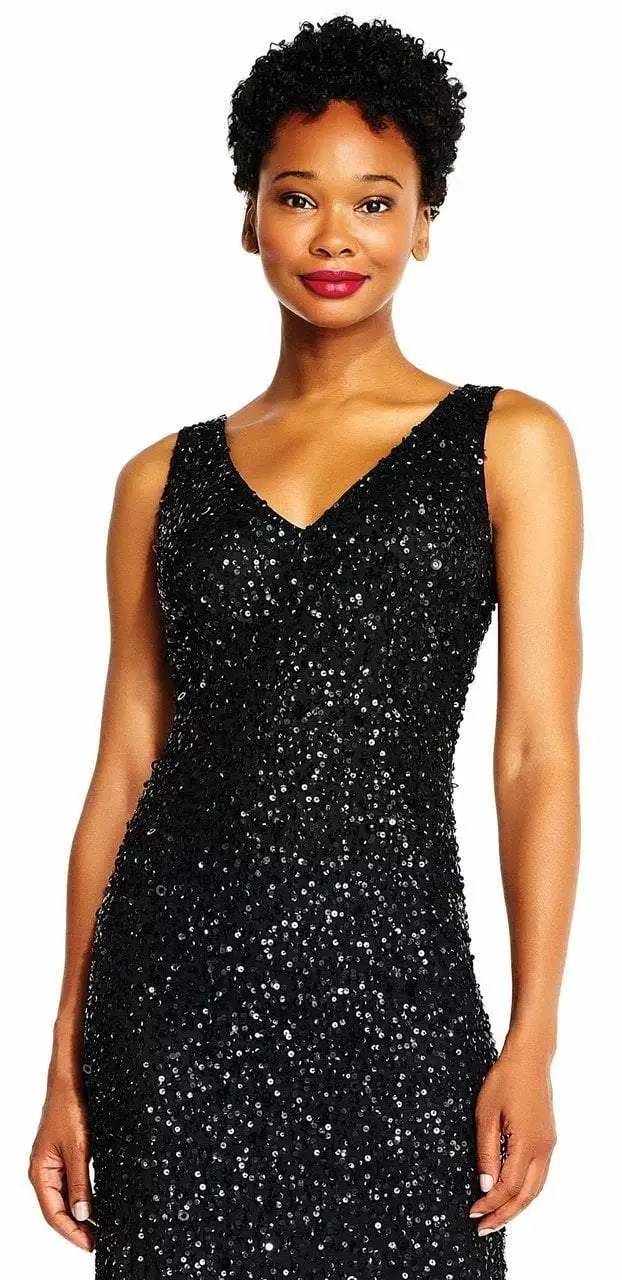 Sizzle and shine with this intricately designed Adrianna Papell AP1E201867 evening dress. This sleeveless gown is framed in V-neckline and back, with fully beaded and sequin embellished mesh fabric over comfortable stretch knit inner lining. This gown finishes at full length with modest back sweep train. Wear this brilliant Adrianna Papell creation for a sensational effect that will wow the crowd as you glide past them. Great for Bridesmaids, Evening formal, Party Dress, Wedding Guest, Bridal Shower.