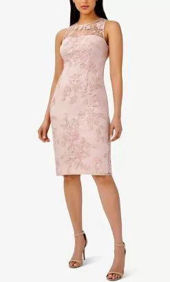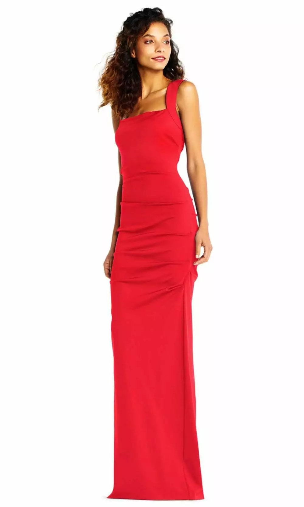 Enter the room with stunning presence wearing this Adrianna Papell AP1E202255. A solid jersey long sheath dress with Square neckline, sleeveless fitted bodice with fine ruching and a cut out back style. The dress is ensured with hidden zipper at the back and is finished with a wispy godet leading the subtle sweep train. You are sure to sizzle all night wearing this creation by Adrianna Papell!