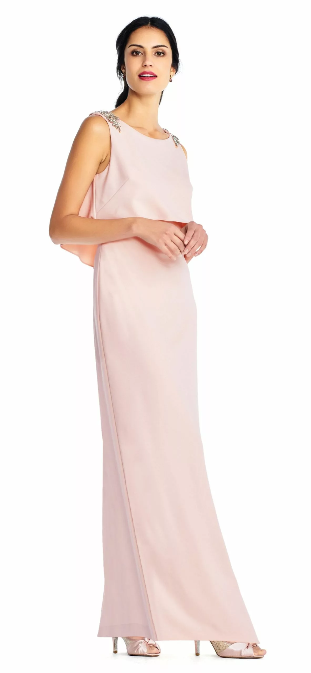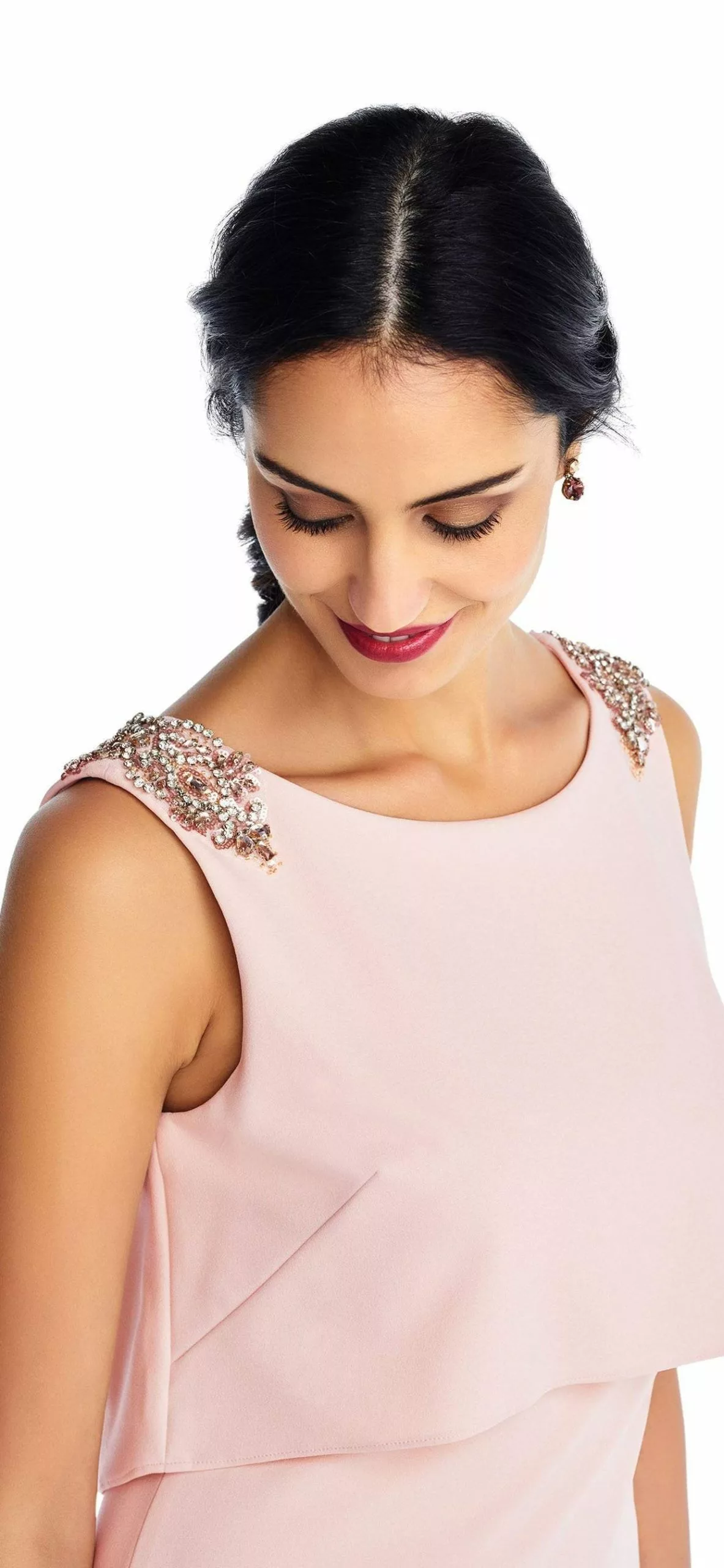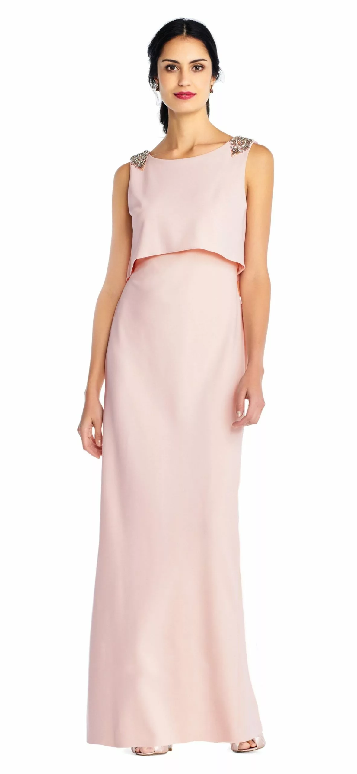Look fantastic for your next formal event in this evening dress by Adrianna Papell AP1E202958. This sleeveless dress glams in a bateau neckline with embellishments at the shoulders. This mock two piece look has a V-back and a zipper closure while the full length sheath skirt is accented with a center back slit. This Adrianna Papell creation is truly remarkable!