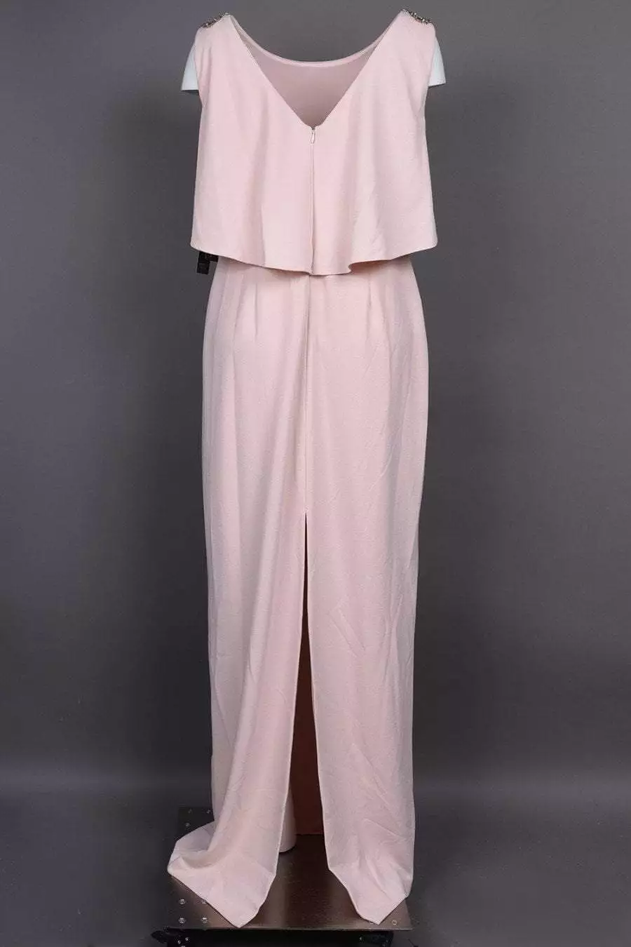 | Details: | Sleeveless, Mock two piece, Sheath skirt, Embellished shoulders, V-back, Back zipper, Center back slit |