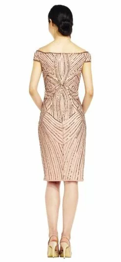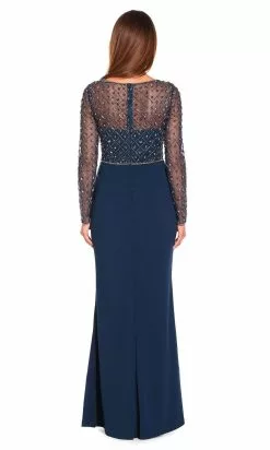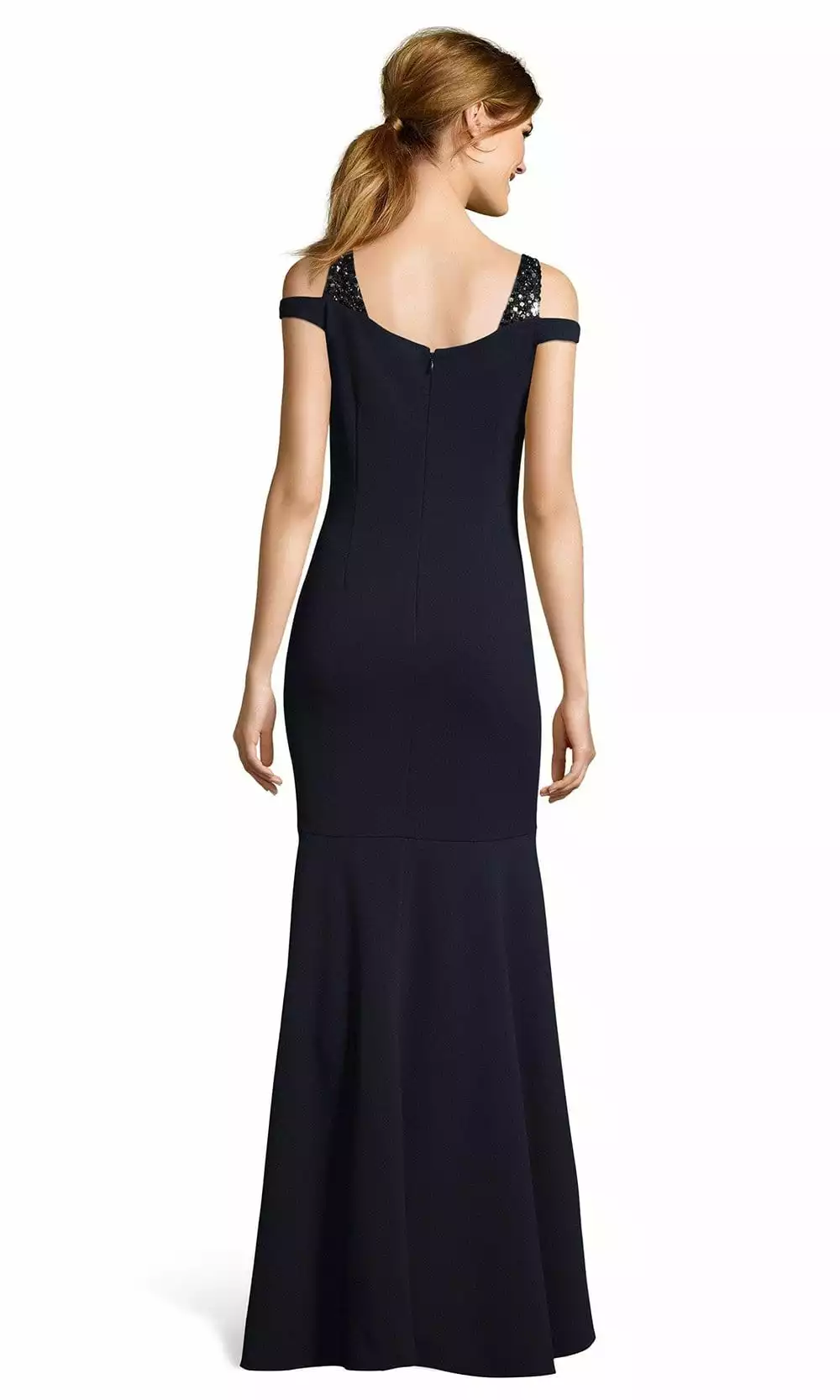 Look absolutely beautiful in this elegant evening dress by Adrianna Papell AP1E202959. Bead embellishments design the V neckline supported by off-shoulder straps, which forms the cold shoulder cutout detail. This dress presents a trumpet silhouette which cascades to a high low hemline as the reveals a scoop cutout, secured with a center zipper closure detail. This classy Adrianna Papell dress parades the classy style. Model is wearing Midnight color.