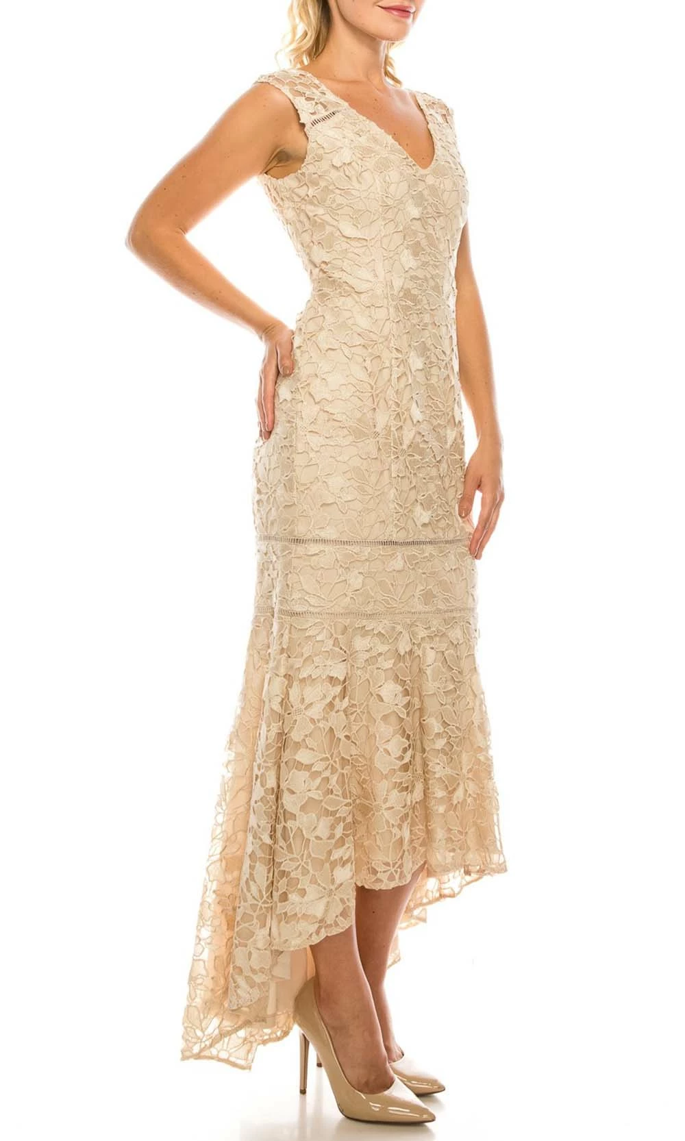 Portray the rich variety in design of this dress by Adrianna Papell AP1E200762. Crafted in guipure lace fabric, this fully-lined dress features a V-neckline sheer cap sleeves, lattice insets, high low skirt, and a sheath silhouette. Adrianna Papell is a stunning look for your evening occasion.