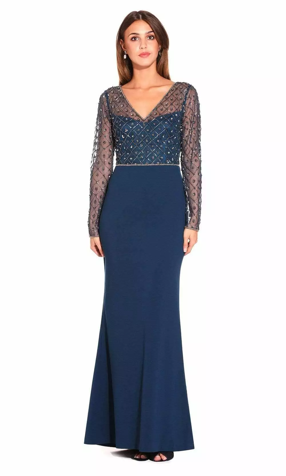 Showcase your sophisticated sense of style in this stunning evening dress by Adrianna Papell AP1E203730. Designed in classy stretch crepe, this floor-sweeping dress is attractively offset by a tulle bodice, hand adorned with an ornate lattice pattern in shining beads and sequins. Designed to flatter your form, this sheath gown features long, sheer sleeves a v-neckline, and is partly lined in soft fabric, for a fine fit. Glamour gets gorgeous in this Adrianna Papell piece.