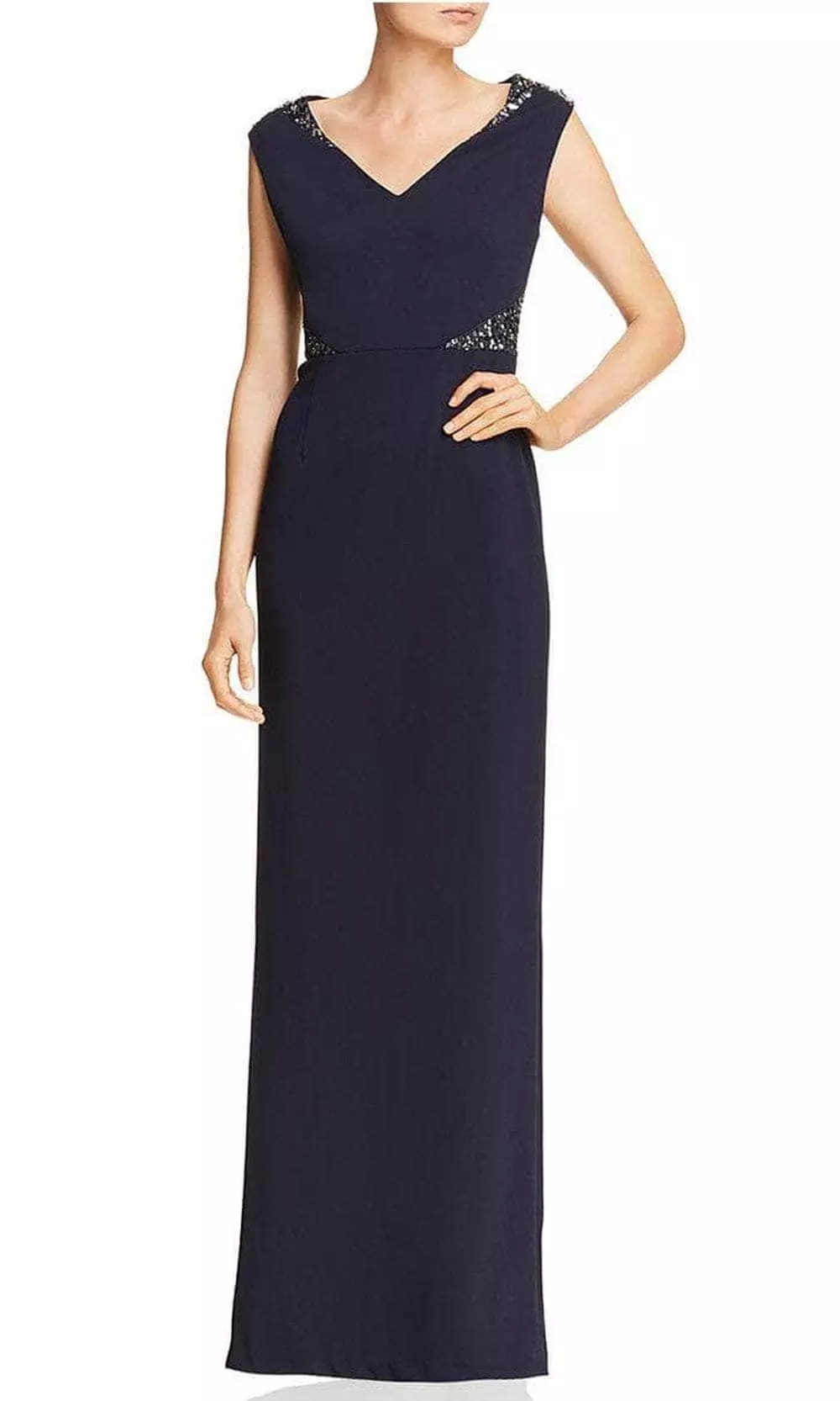 Walk in glamour and let all heads turn on you in this creation by Adrianna Papell AP1E204021. This formal gown fashions cap sleeves and V neckline as the fitted bodice is accented with beads and sequins embellishment. This also highlights a full back with a zipper closure and a back slit. The skirt pools down into a full-length sheath silhouette. This Adrianna Papell gown definitely parades the elegant and classy style. Couture Candy is committed to provide the very best when it comes to dresses for every occasion, and we are delighted to have Adrianna Papell on our side to aid us in delivering exquisite dresses for various occasions that are sure to make heads turn. Model is wearing the Midnight color.
