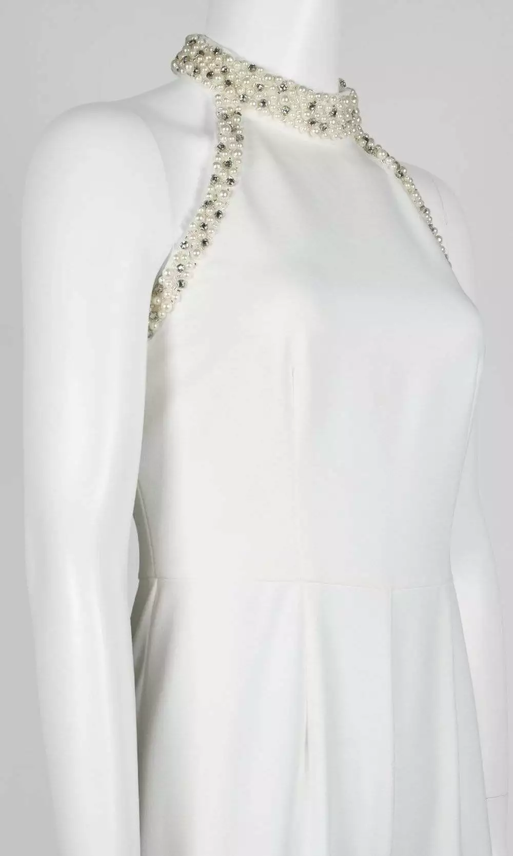 | Details: | Crepe, Sleeveless, Pearl embellishments, Fitted bodice, Back zipper, Open back |