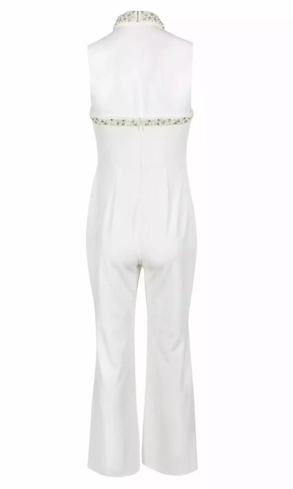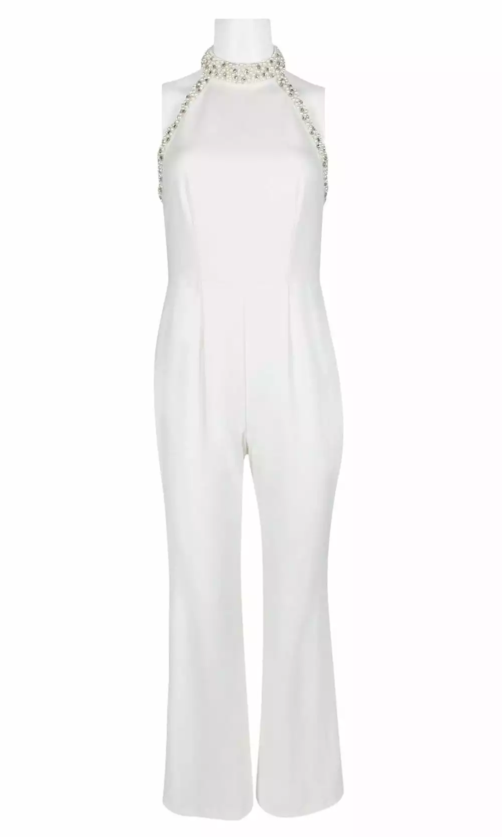 Turn heads instantly when you wear this style by Adrianna Papell AP1E204372. Boasts a sleeveless, pearl-beaded high halter neckline. The fitted bodice flaunts an open back. The bottom is tailored in a pair of leg pants. Charm everyone from all angles as you shine all night long in this Adrianna Papell masterpiece.