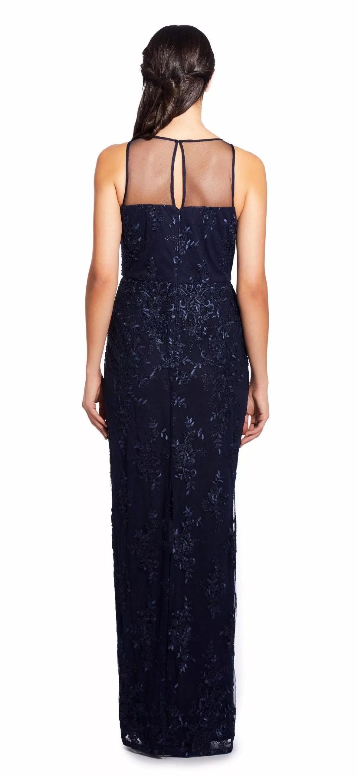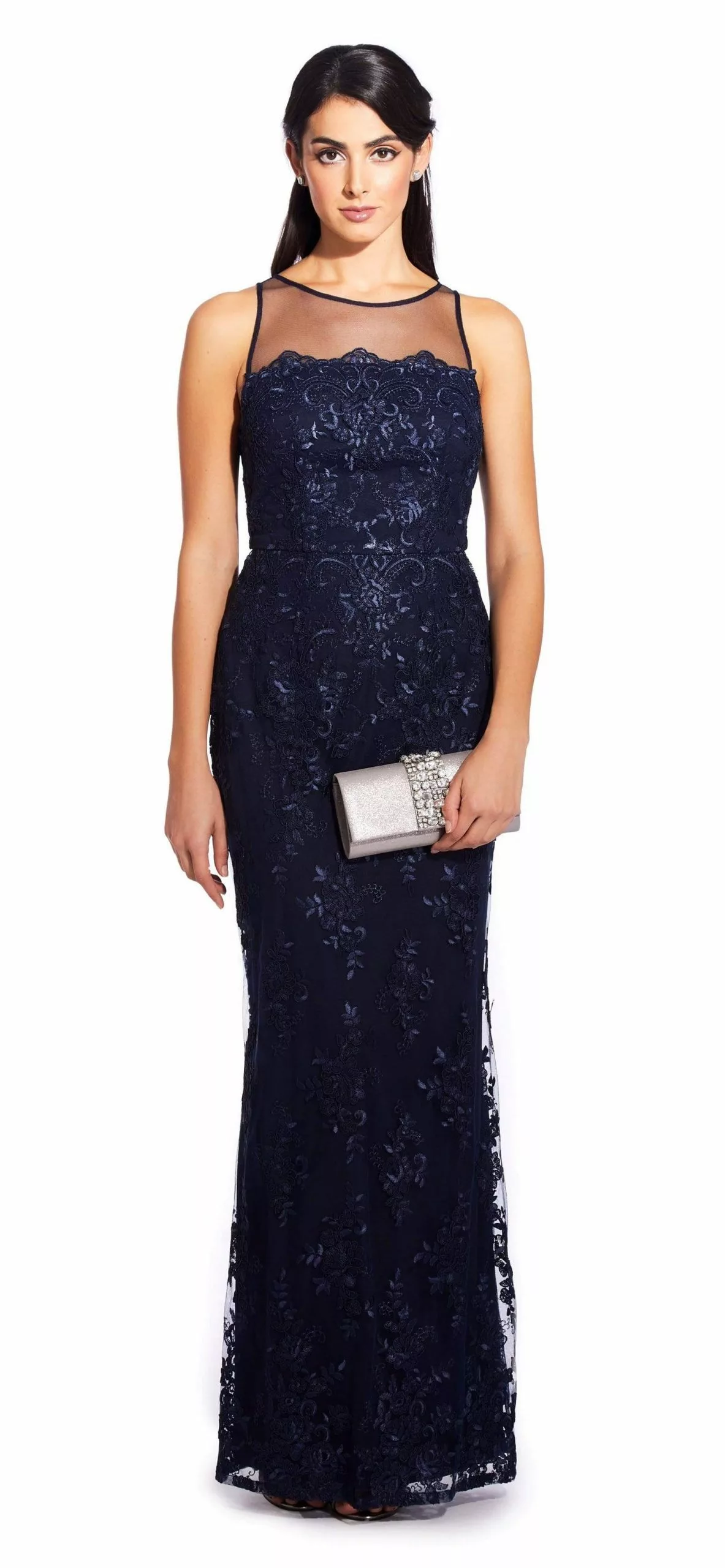 Look your absolute best in this classy creation by Adrianna Papell AP1E204699. This stunning long evening dress showcases an illusion bateau neckline which lends an ultra-sophisticated touch to this floor-sweeping formal dress, prettily offsetting the ornate floral embroidery and corded detailing. Scalloped lace details trim the neckline for a striking look. This evening dress is fully lined for a smooth fit, while a deep back slit that adds yet more glamour and ensures ease of movement. Envision the ideal evening in this Adrianna Papell ensemble.