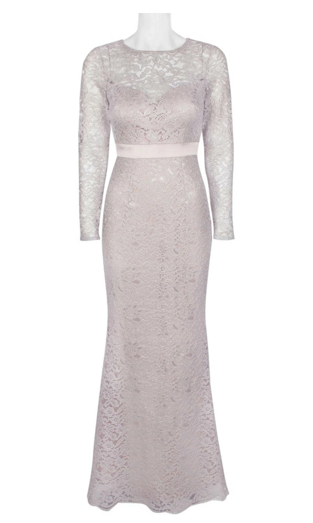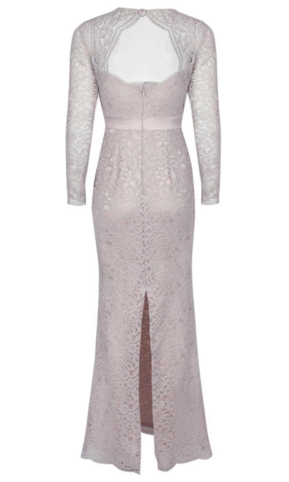 | Details: | Lace, Long sleeves, Fitted bodice, Embellishments, Back keyhole, Back zipper, Sheath skirt, Center back slit |
