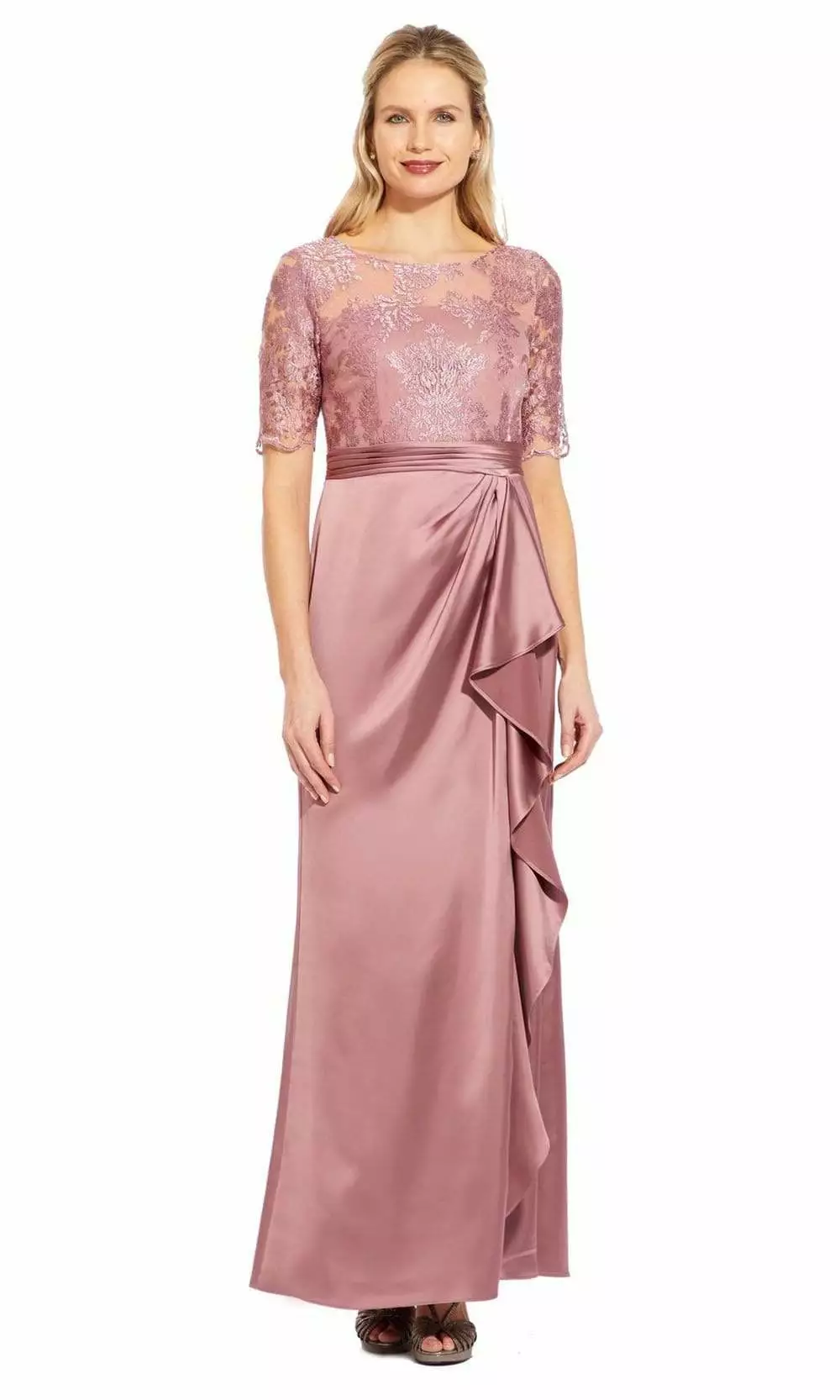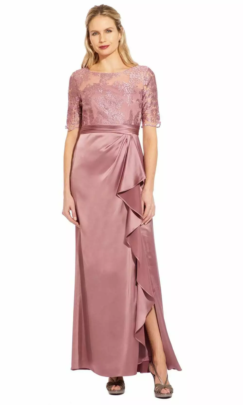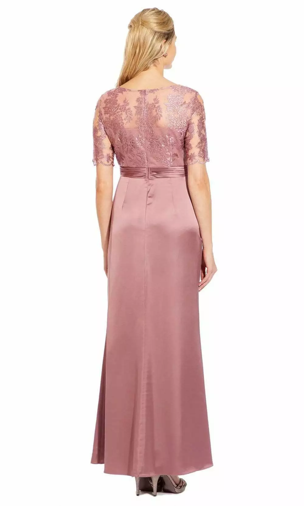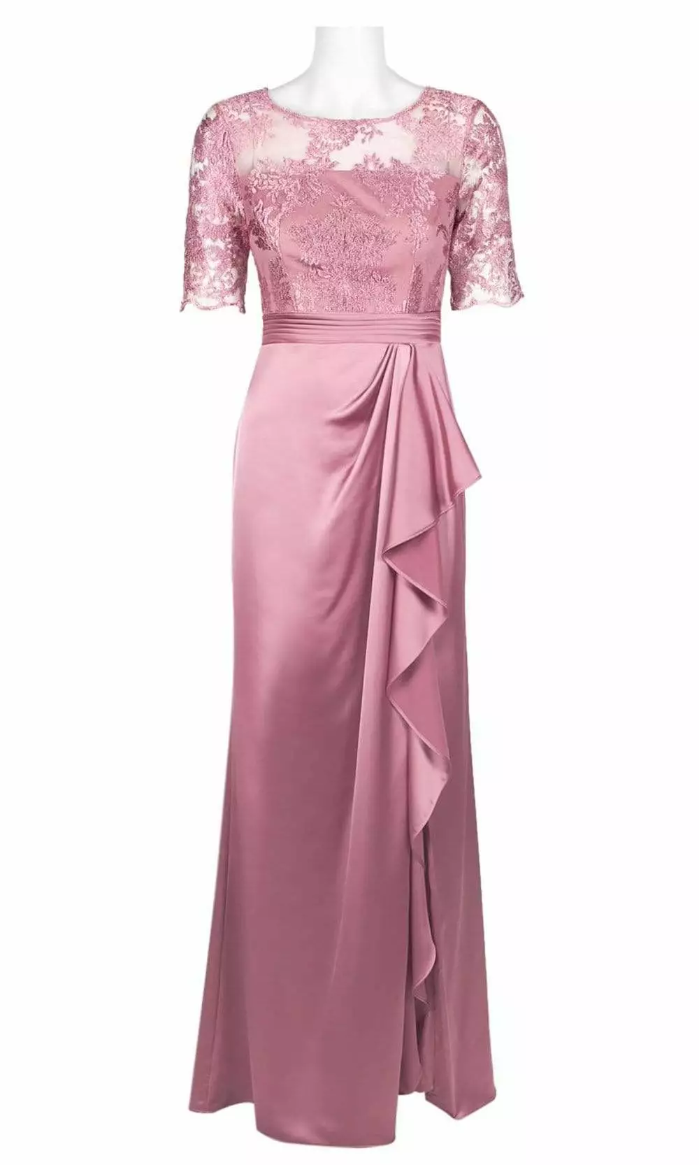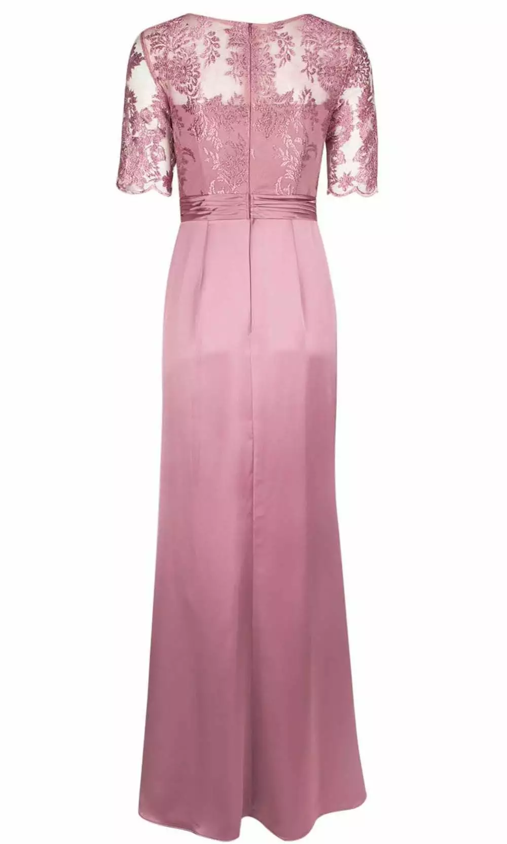 | Details: | Satin, Quarter length sleeves, Fitted bodice, Pleated waist, Sheath skirt, Slit, Flutter side, Back zipper |