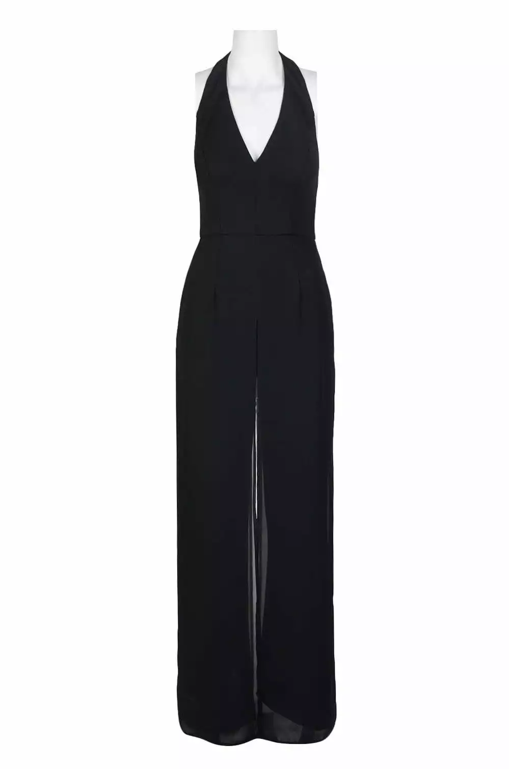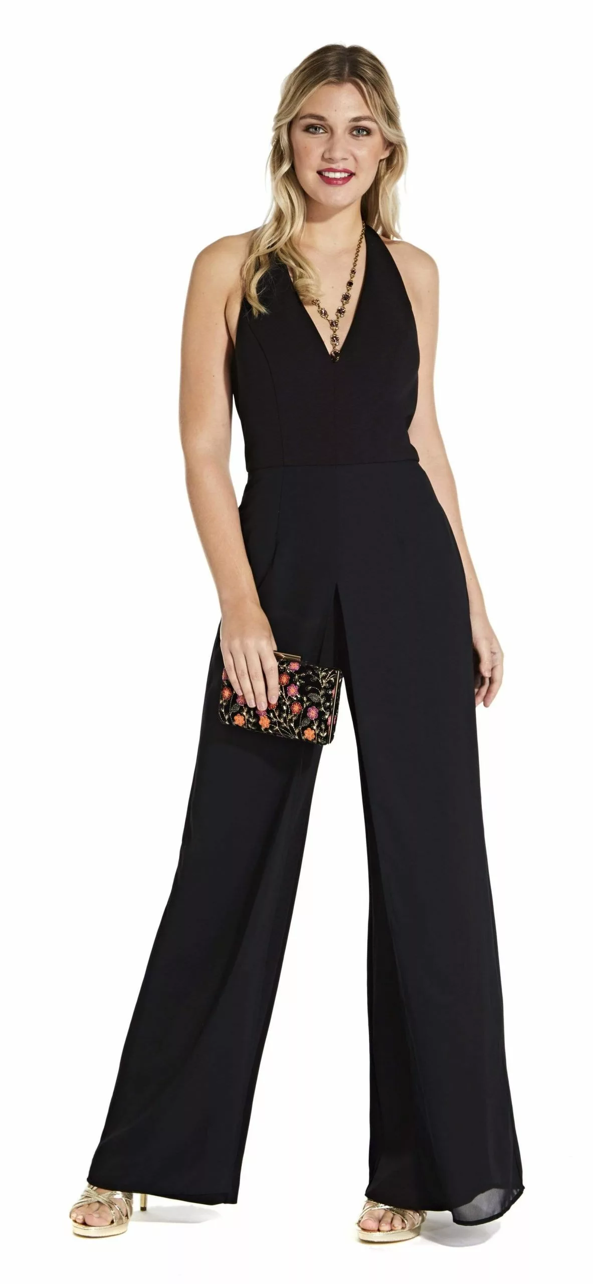 Show off your trendsetting style when you wear this look by Adrianna Papell AP1E205170. Be a vision in a sleeveless, halter V-neckline with a mid-open back and a zipper closure. The fitted bodice gives way to a pair of long loose leg pants. Dress to impress with this Adrianna Papell style.