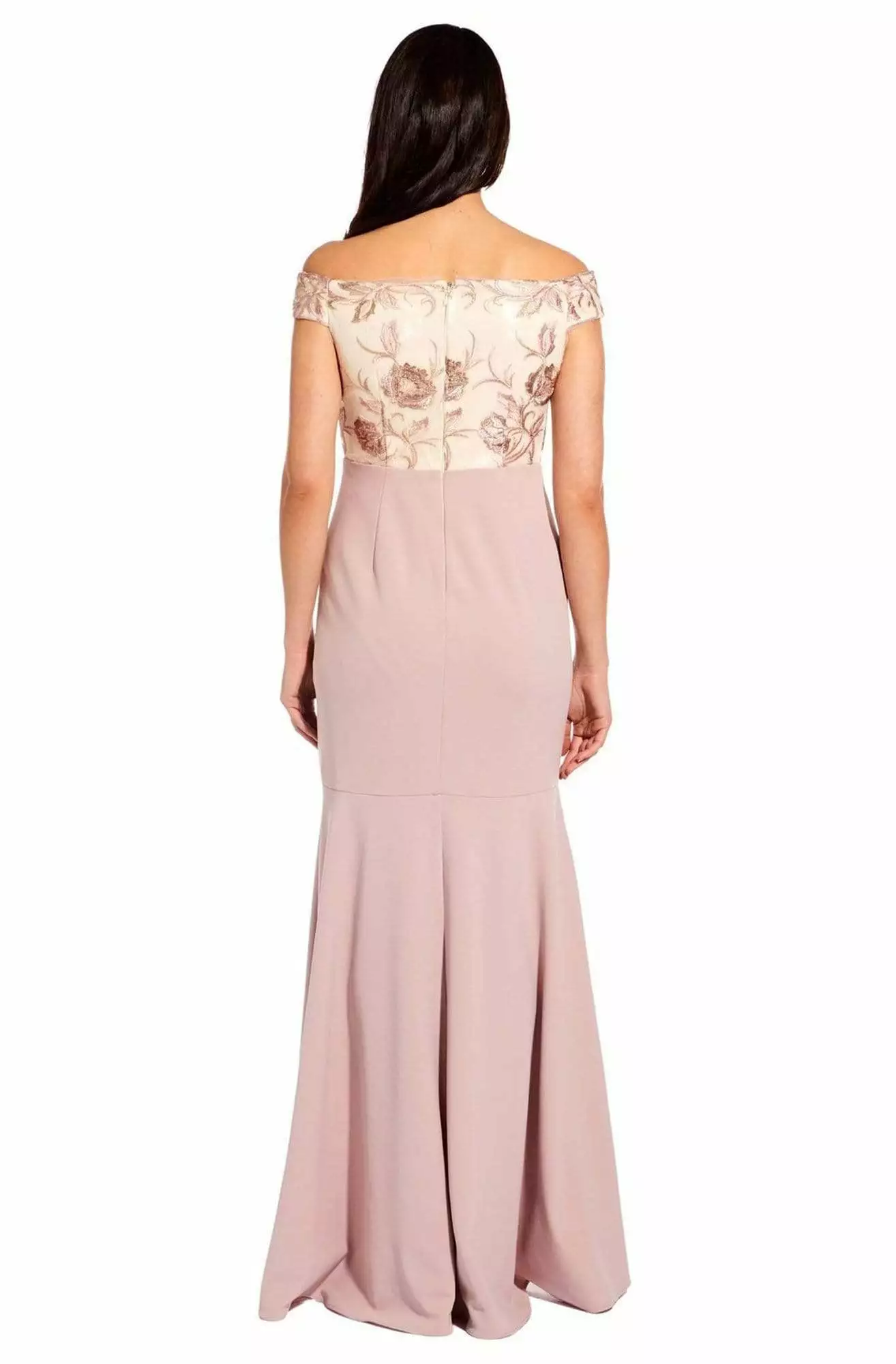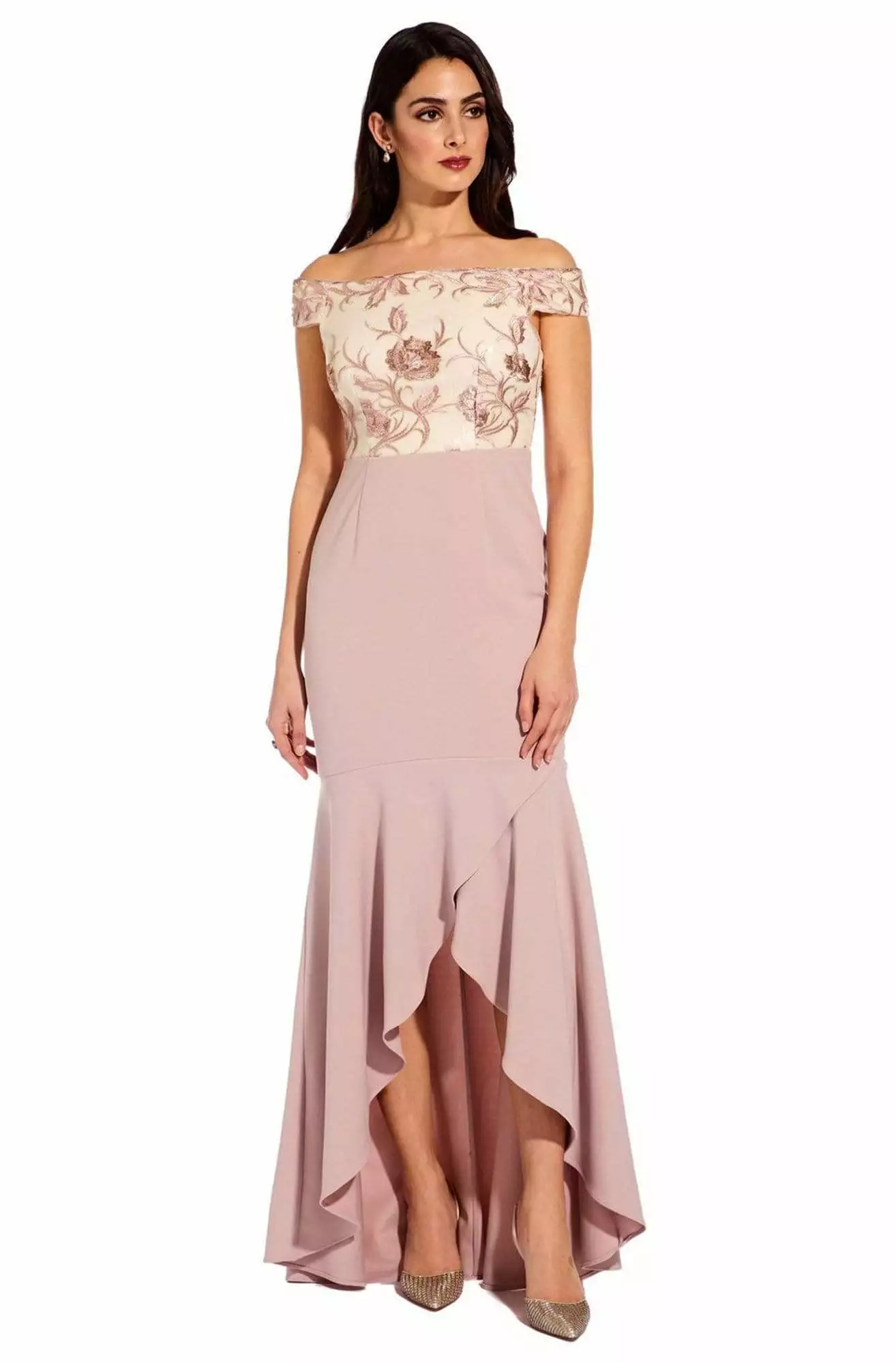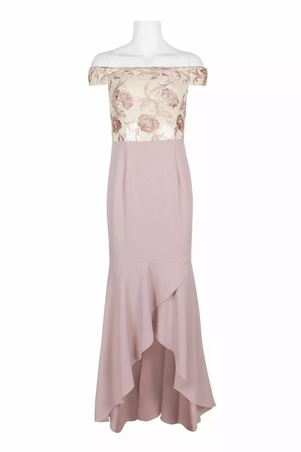 Dominate this luxurious event as you saunter into the ballroom with sass and allure in this chic dress by Adrianna Papell AP1E205308. Designed with embroidery and sequins, this dress has an off the shoulder neckline with a fitted bodice. The back has a zipper closure and from the waist flourishes a high low trumpet skirt with flutter details. Exude a charm that is meant to mesmerize the elite crowd in this gorgeously decadent Adrianna Papell dress.
