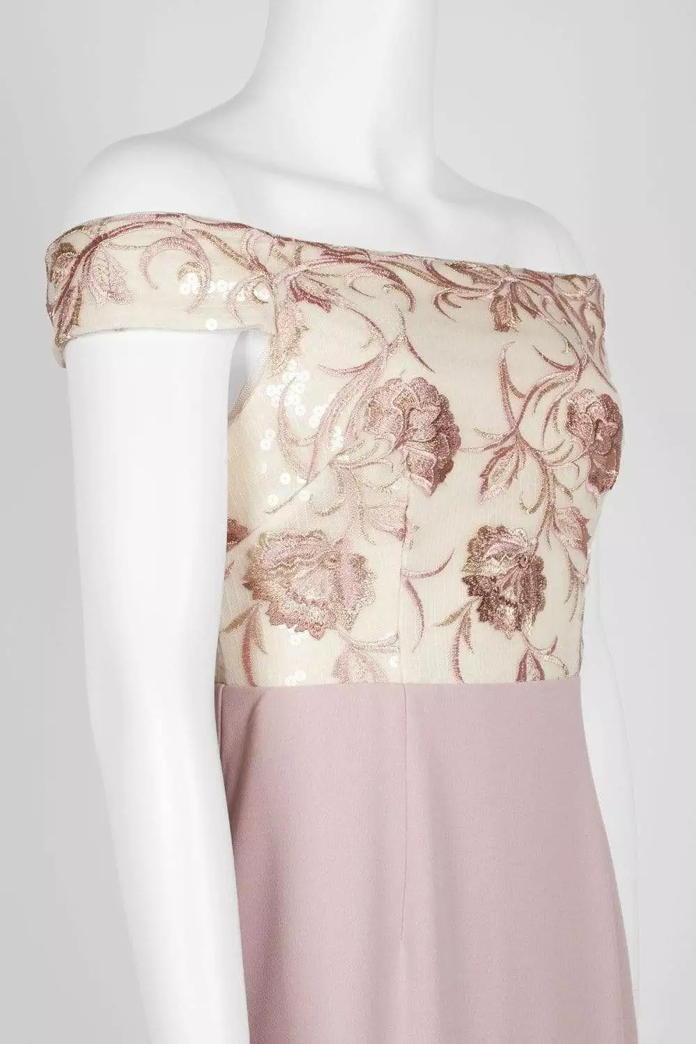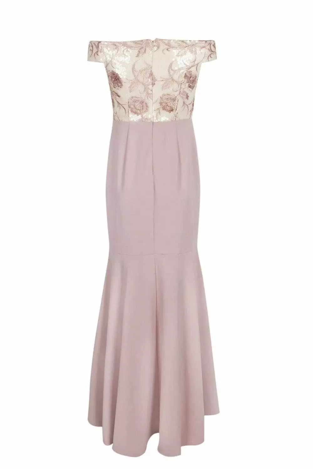 | Details: | Off-Shoulder sleeves, Fitted bodice, High low hemline, Trumpet skirt, Flutter details, Back zipper, Embroidery, Sequins |