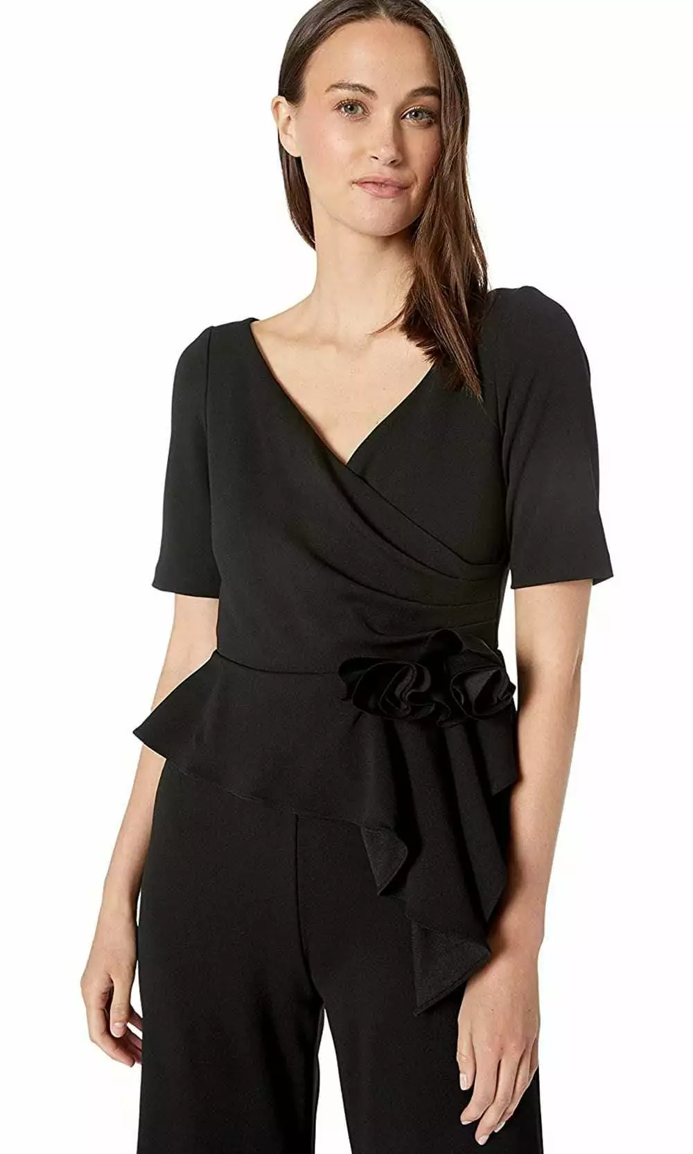 Be the delight of everyones eyes in Adrianna Papell AP1E205587. This stretch crepe style makes a statement in a V neckline with short sleeves. The waist has a gathered side and a peplum detail. The bottom is tailored in a pair of long leg pants. Look sophisticated and mature in this simple yet chic Adrianna Papell design.