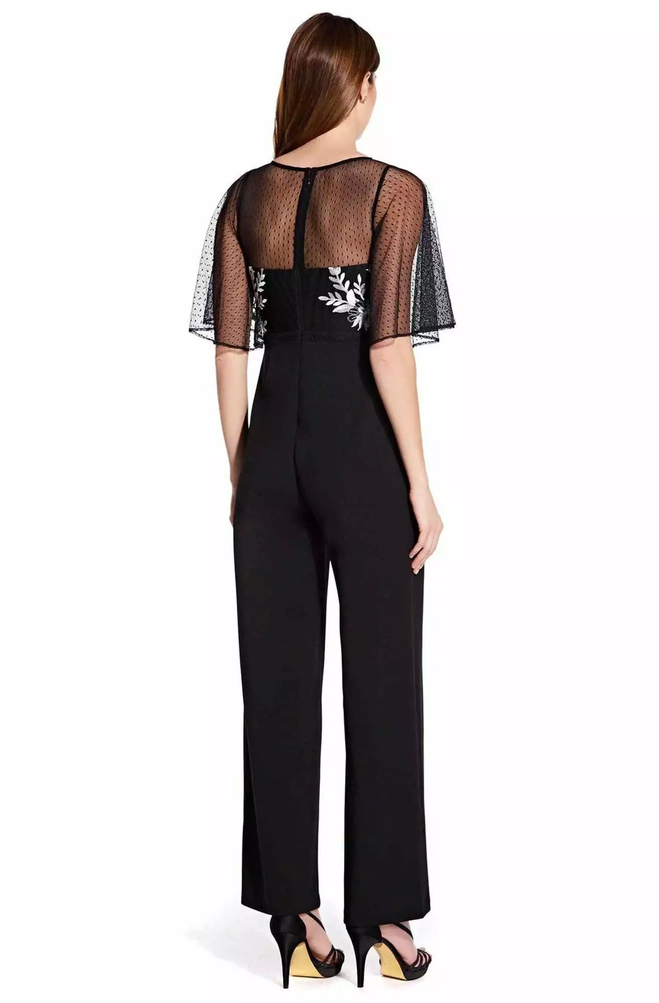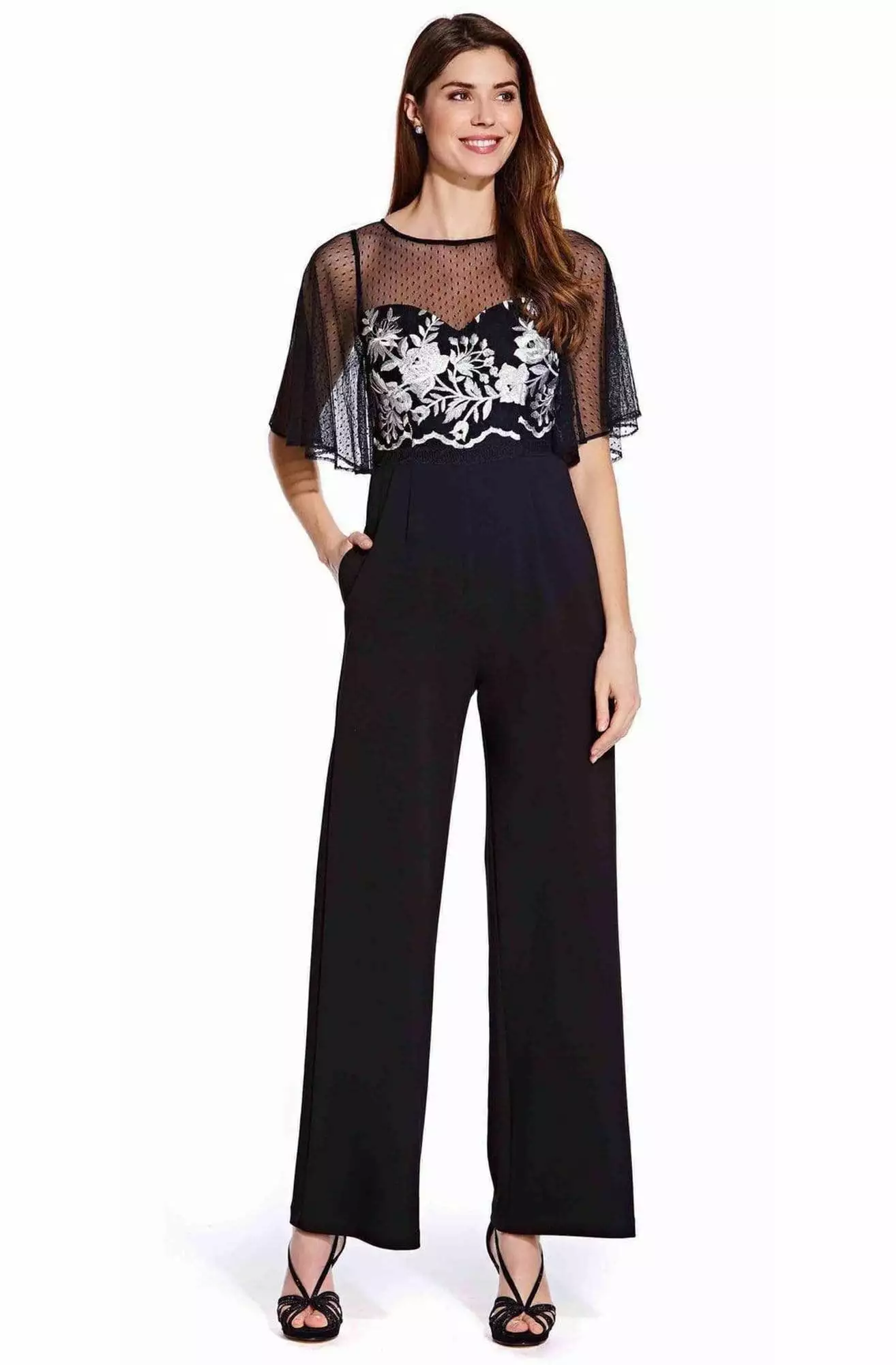 Get ready to shine in this fabulous Adrianna Papell AP1E205755 creation. Flashes in a bateau neckline with flutter sleeves. The fitted bodice is designed with floral embroidery. The back has a zipper closure while the full length leg pants are styled with pockets. This Adrianna Papell style is a sure standout on your next evening social event.