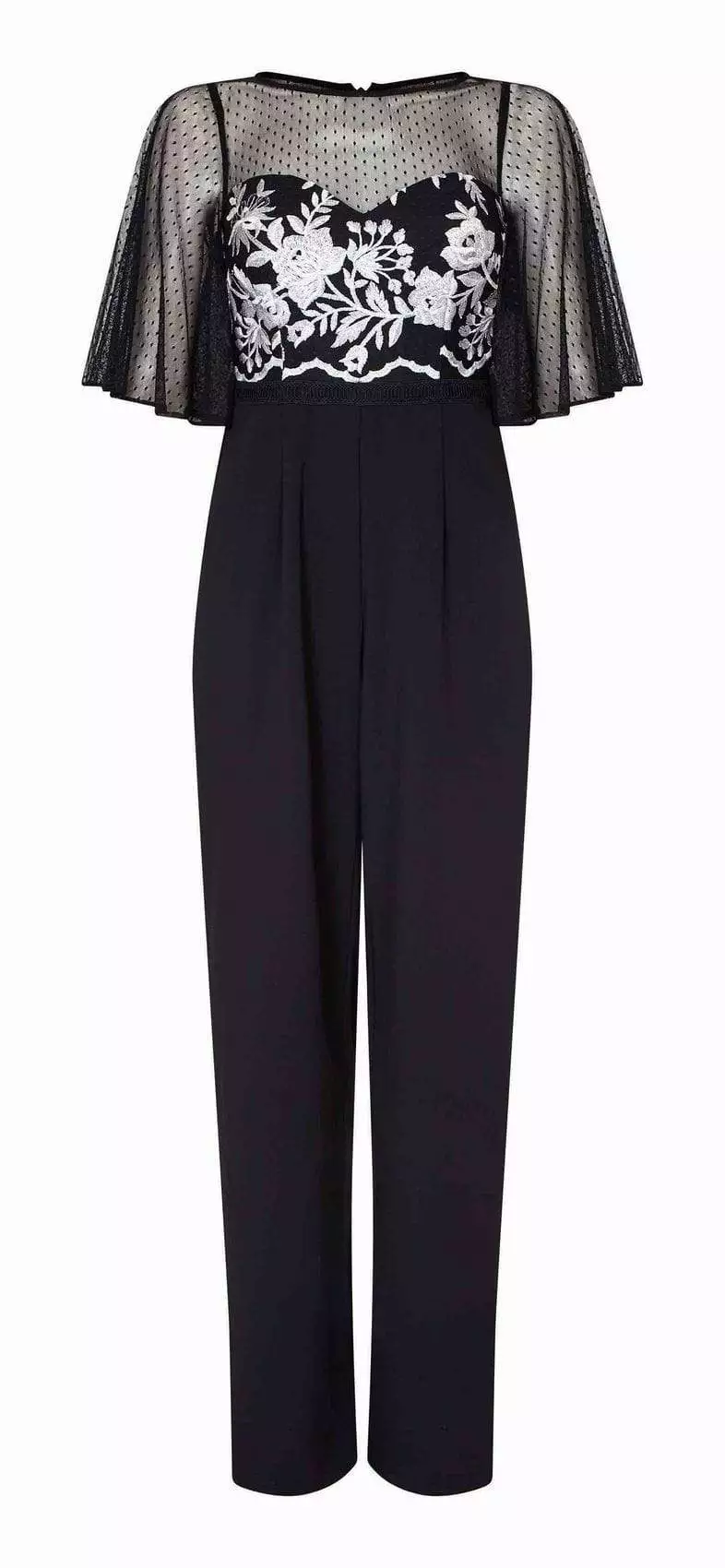 | Details: | Flutter sleeves, Floral embroidery, Leg pants, Pockets, Back zipper |