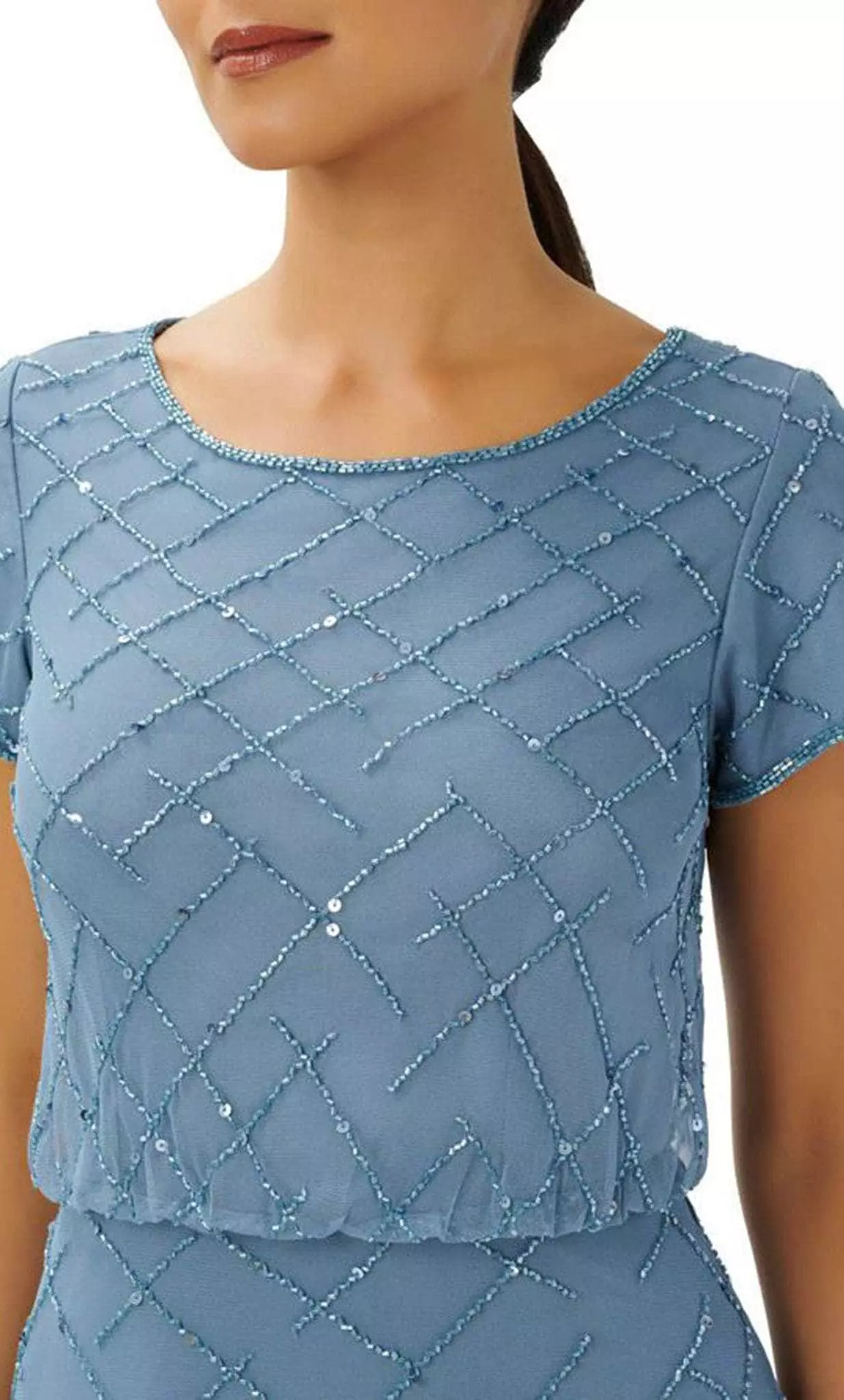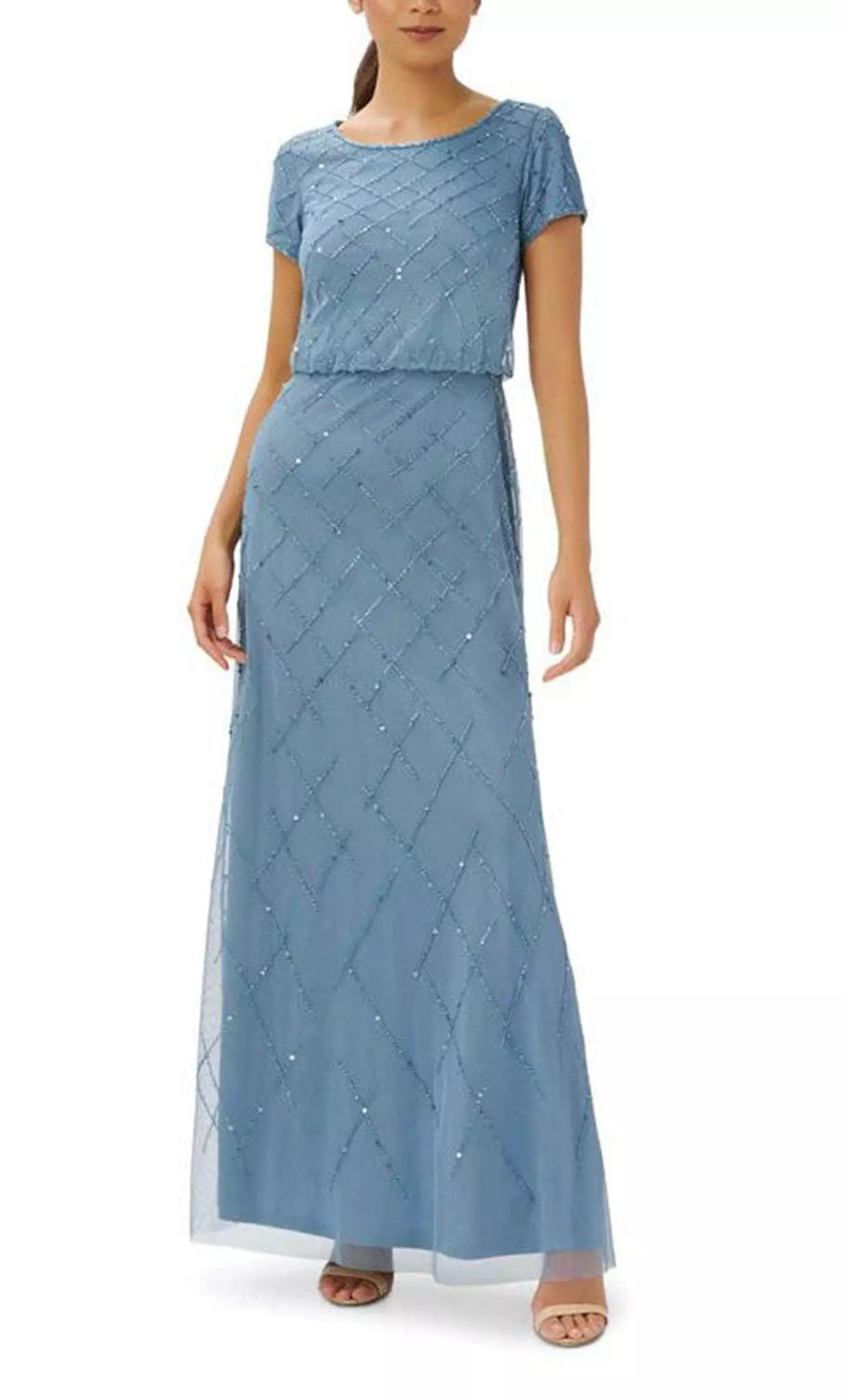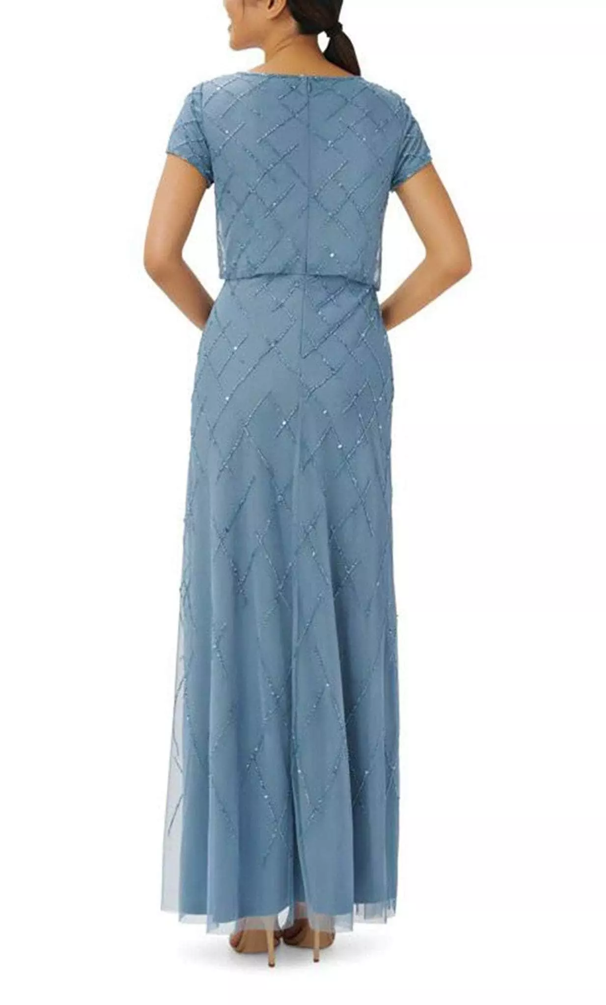 Showcase your brilliant esprit in this bellissima Adrianna Papell AP1E208942. The short sleeves and beaded patterns create a glamorous and sophisticated look that’s perfect for a special occasion. The back zipper ensures a seamless finish, while the sheer hem adds a touch of romance and femininity. The long length and natural boat neckline create a classic and timeless silhouette that flatters your figure. You’ll look fantastic in photos with a beautiful gown from Adrianna Papell AP1E208942! Model is wearing Vintage Blue color.