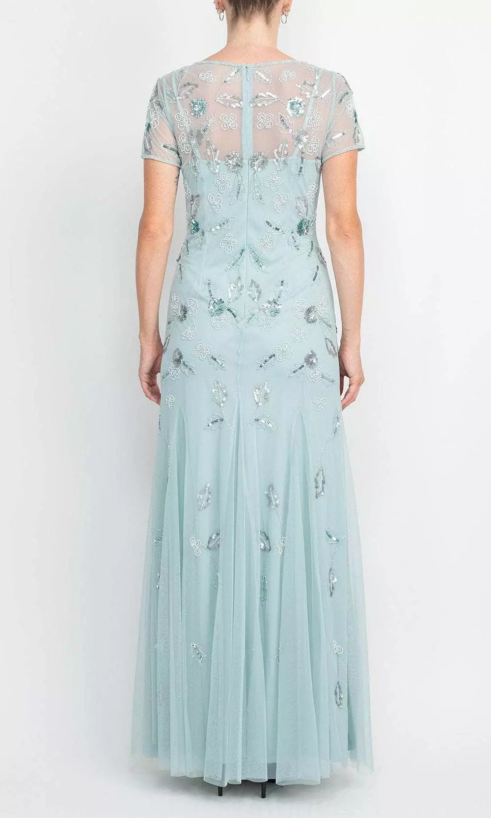 Walk in glamour and let all heads turn on you in this creation by Adrianna Papell AP1E209044. Adorned with gleaming sequins and beadwork that adds sparkle to this beautiful gown. This style features a sheer v-neckline, short sleeves and a partial sheer full fastened by a center zipper. The full length skirt flares in a stunning mermaid silhouette, accented with tulle pleated godets. Fall in love when you slip on this Adrianna Papell AP1E209044 gown. Model is wearing the Aqua Dust color.