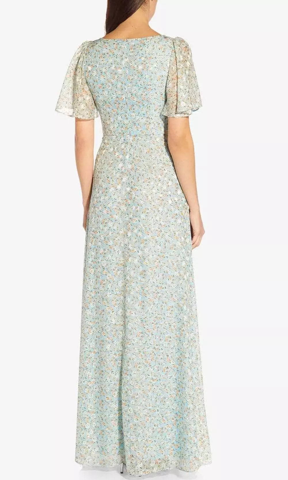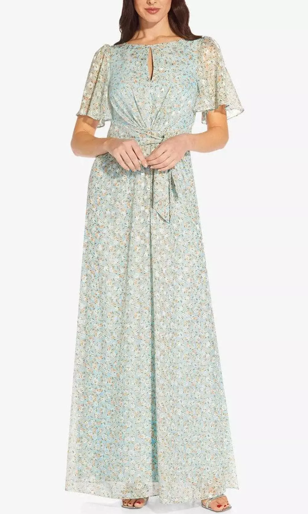 Enchant everyone with your beauty in this Adrianna Papell AP1E209532 creation. Fashioned in floral prints over chiffon fabric, this gown has a bateau neckline, front keyhole and sheer short flutter sleeves. The natural waist features a self-tie belt and ruching detail for a slim fit. In an A-line silhouette, the skirt flows charmingly to a full length hem. A center zipper closure properly secures the full back. Make a memorable moment as you walk when you wear this beautiful Adrianna Papell AP1E209532 masterpiece. Model is wearing the Skyway color.