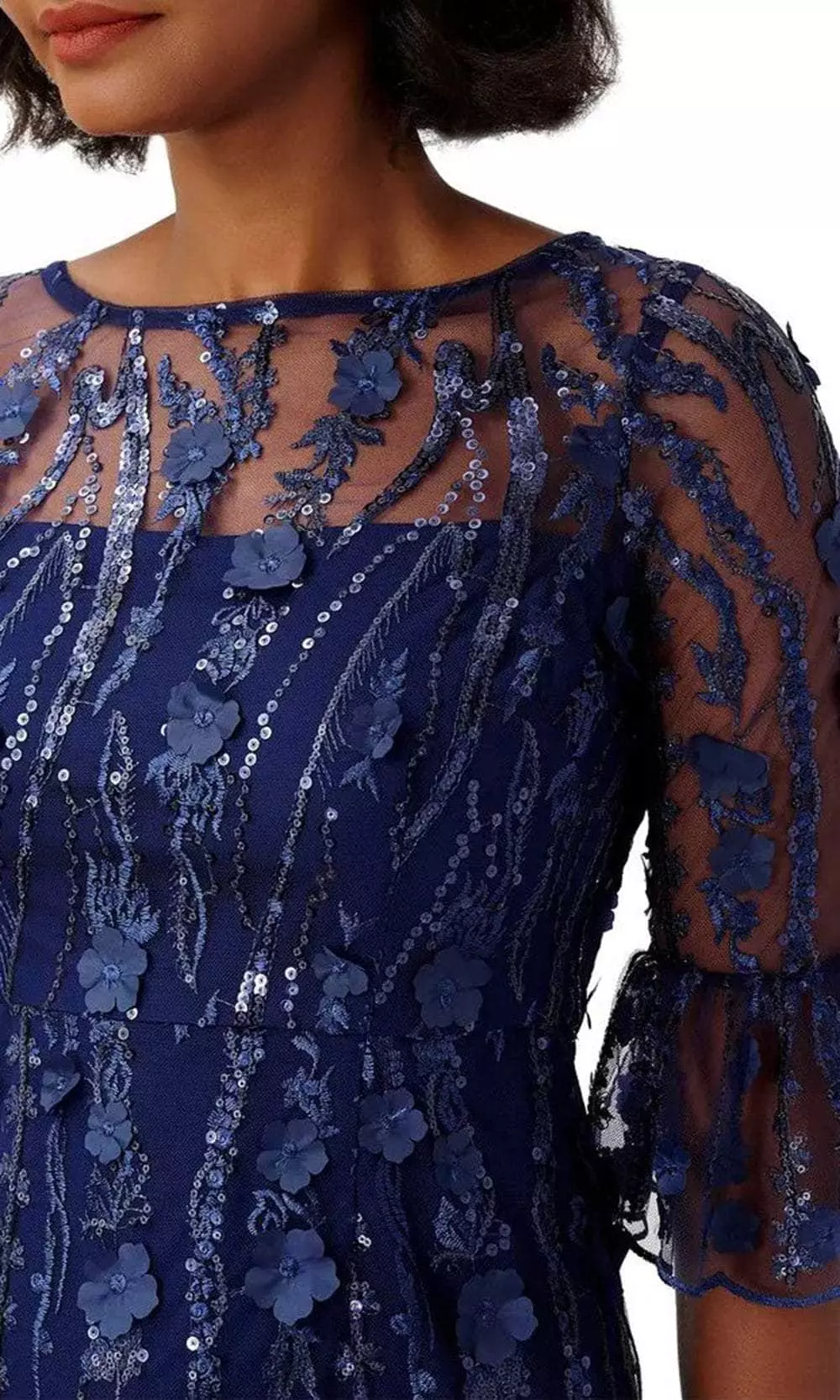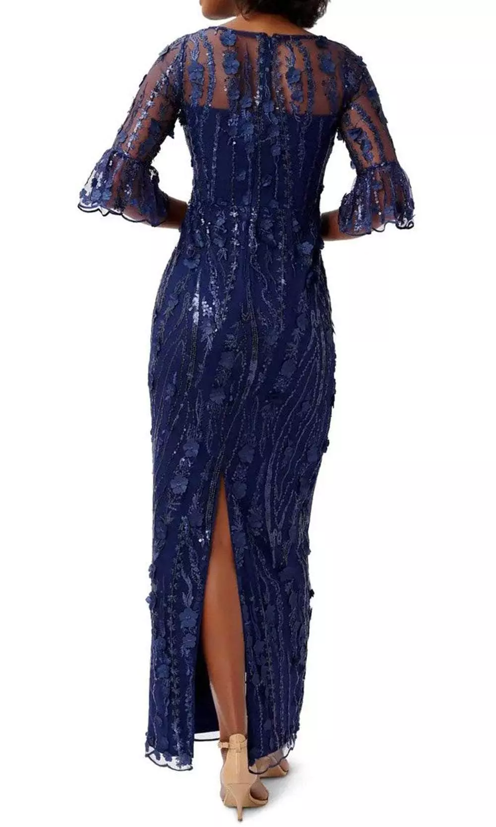 Every detail of this Adrianna Papell AP1E209716 style is dripping with faultless charm. The ethereal fitted gown has stunning 3D floral appliques, embroidery and sparkly sequins embellishment. It presents an illusion bateau neckline, quarter-length bell sleeves and a full back fastened by a center zipper. For ease of movement, the sheath skirt has a center back slit and finishes in a full length hem. This Adrianna Papell AP1E209716 creation will definitely bring out the goddess in you! Model is wearing the Light Navy color.