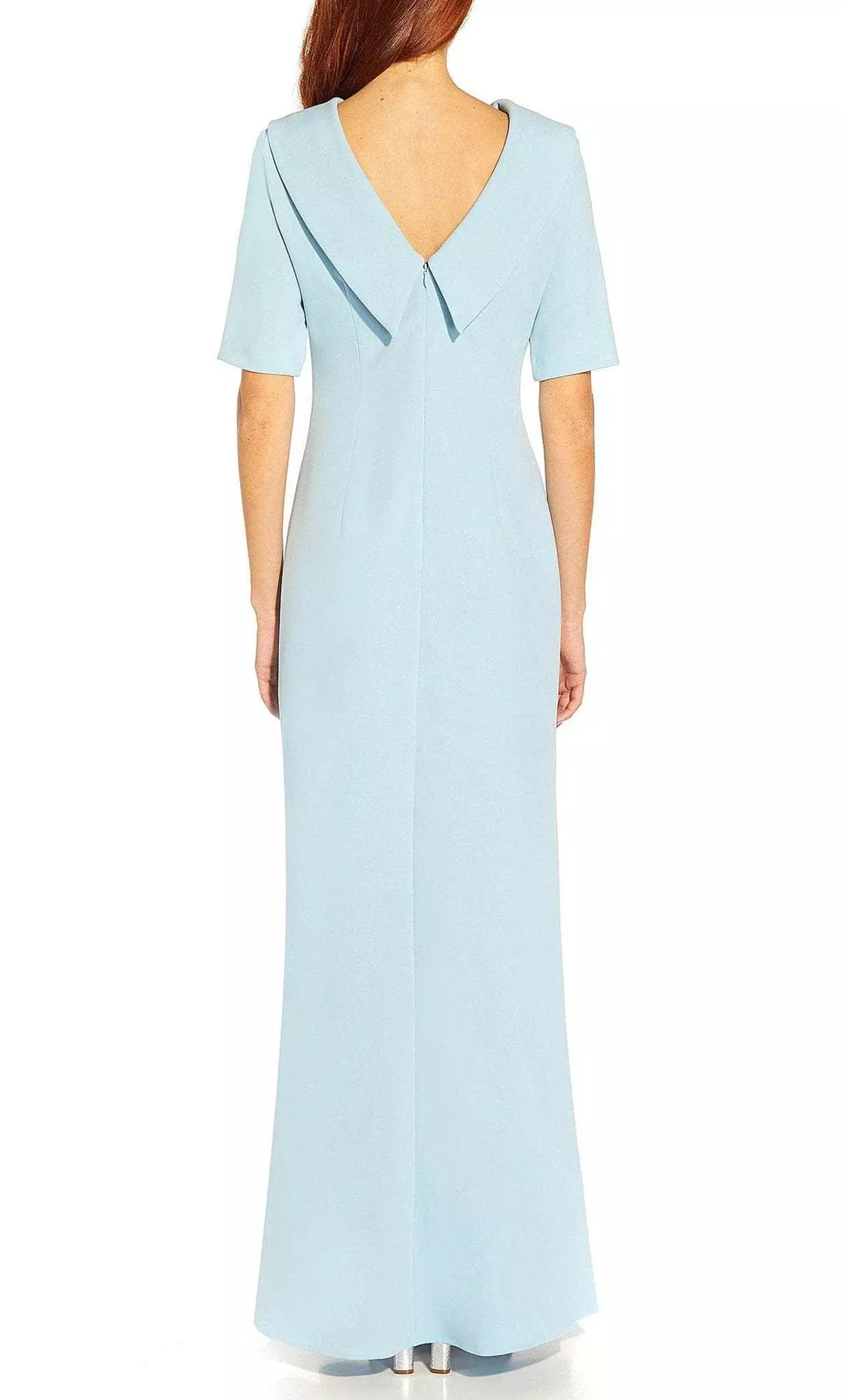 Charm everyone with the timeless beauty of this romantic Adrianna Papell AP1E209924 creation. Beautifully sculpted with tailoring lines that contours along the female form, this gorgeous piece reveals a high jewel neckline with a foldover collar. Designed with a v-open back with a peak collar finish, this ensemble is frames with short sleeves. the sheath skirt reveals a high slit and full length denouement. Inspire people to bestow you lingering glances while wrapped in this Adrianna Papell masterpiece. Model is wearing the Blue Mist color.