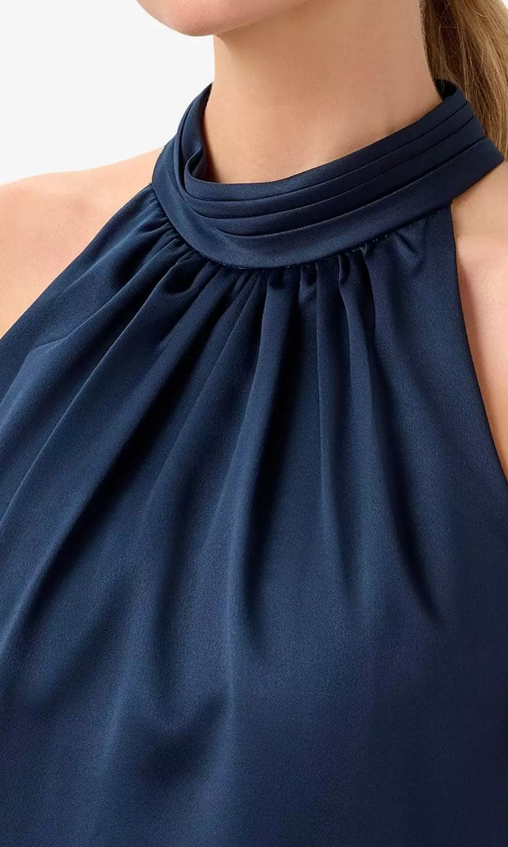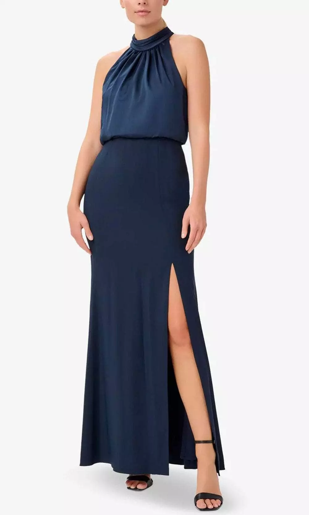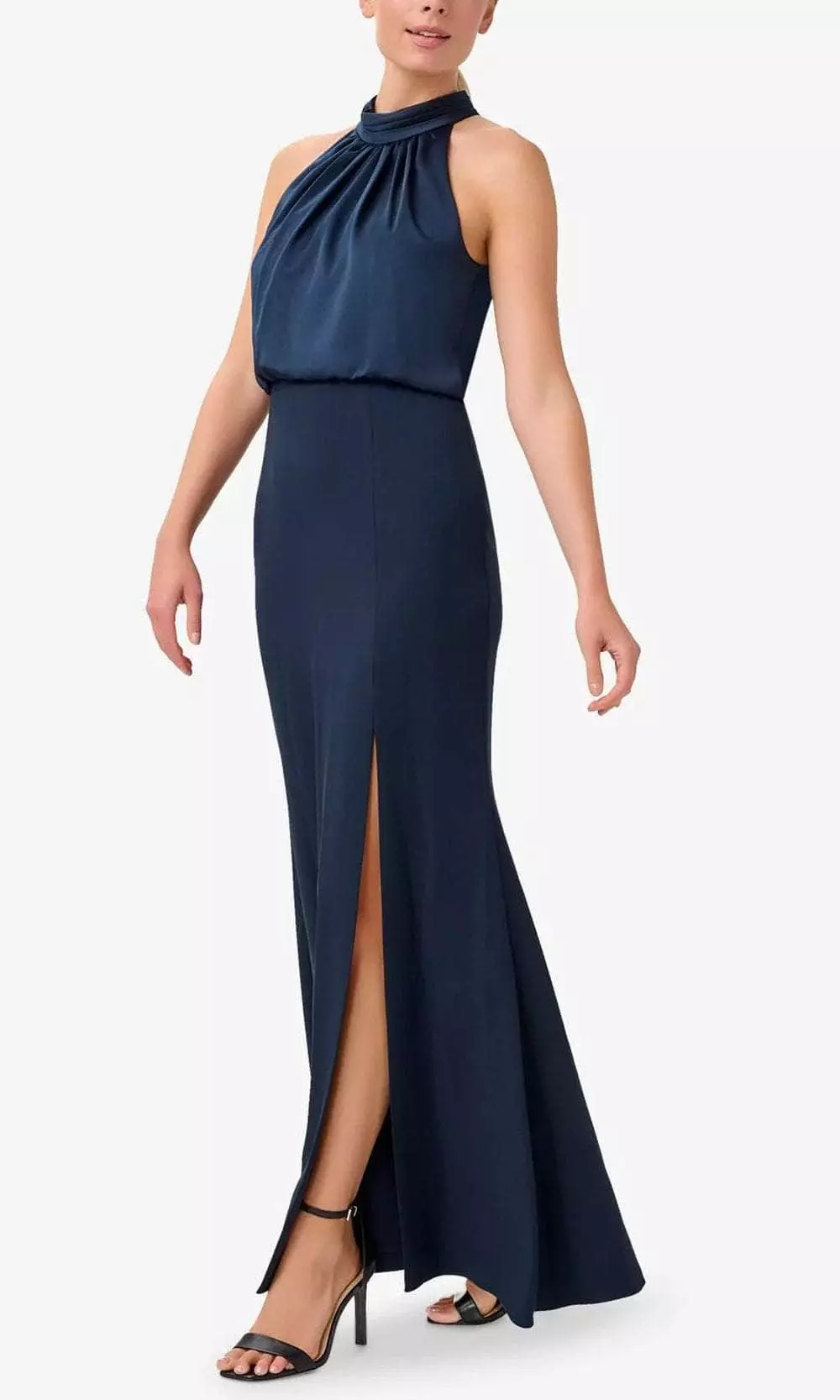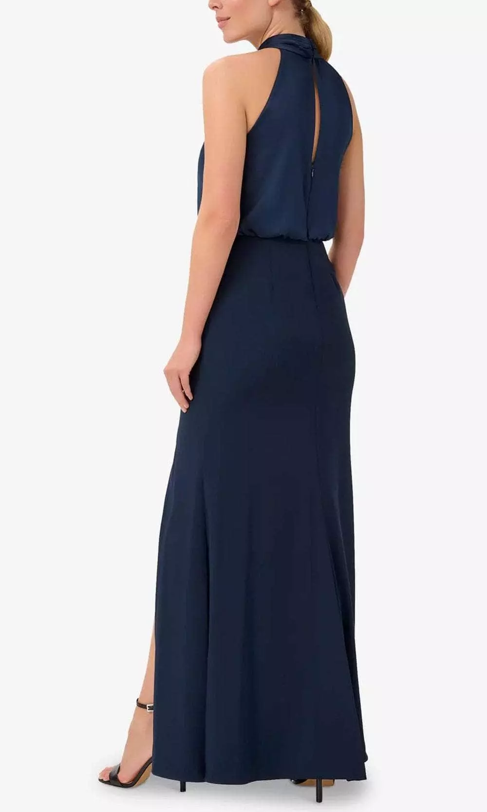 Indulge yourself in glamour as you grace this spectacular event in this Adrianna Papell AP1E210064 P creation. Rendered with fine ruching and a blouson bodice, this simple yet elegant gown features a high halter neckline, cut-in shoulders and a racerback with keyhole detail. The sheath skirt glides to the full length hem and is highlighted with a side high leg slit. This Adrianna Papell AP1E210064 P gown is specially designed to make that special occasion worth reminiscing. Model is wearing the Dark Navy color.
