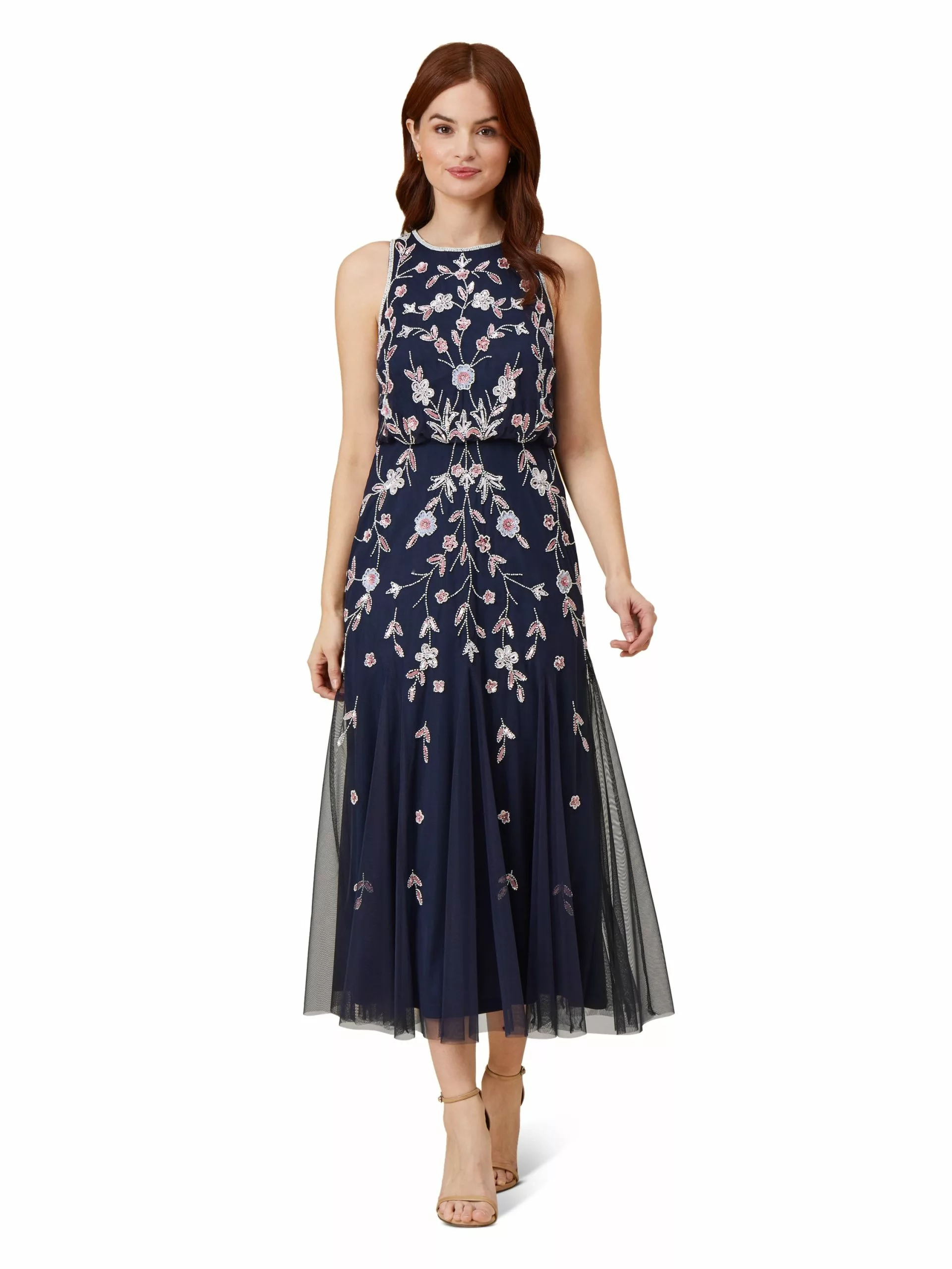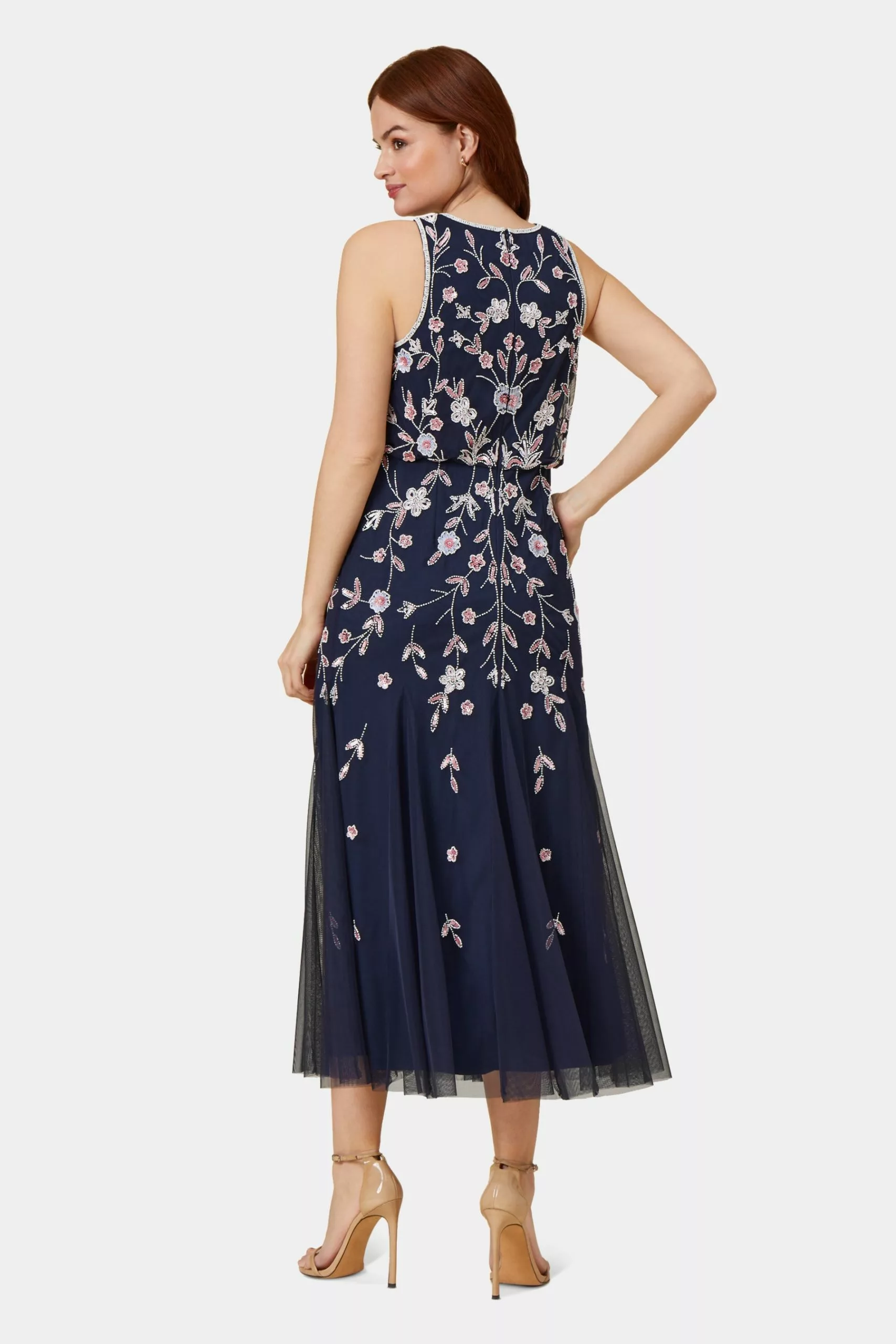 This sleeveless, floral midi Beaded Blouson Dress is a must-have in your closet. Featuring a cinched waist and flowy skirt, pair this beautiful piece with your favorite earrings and strappy heels for that effortless style statement.
