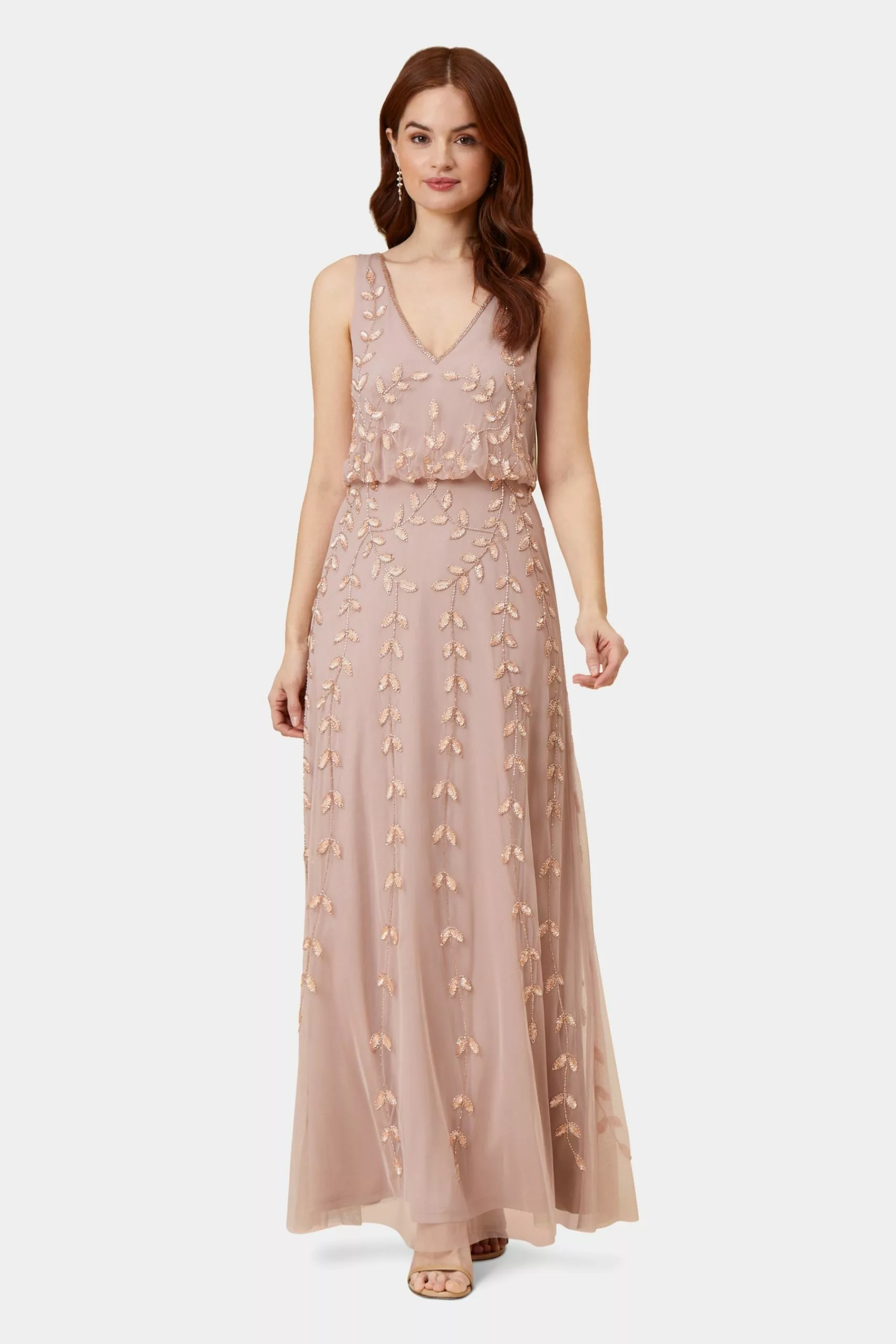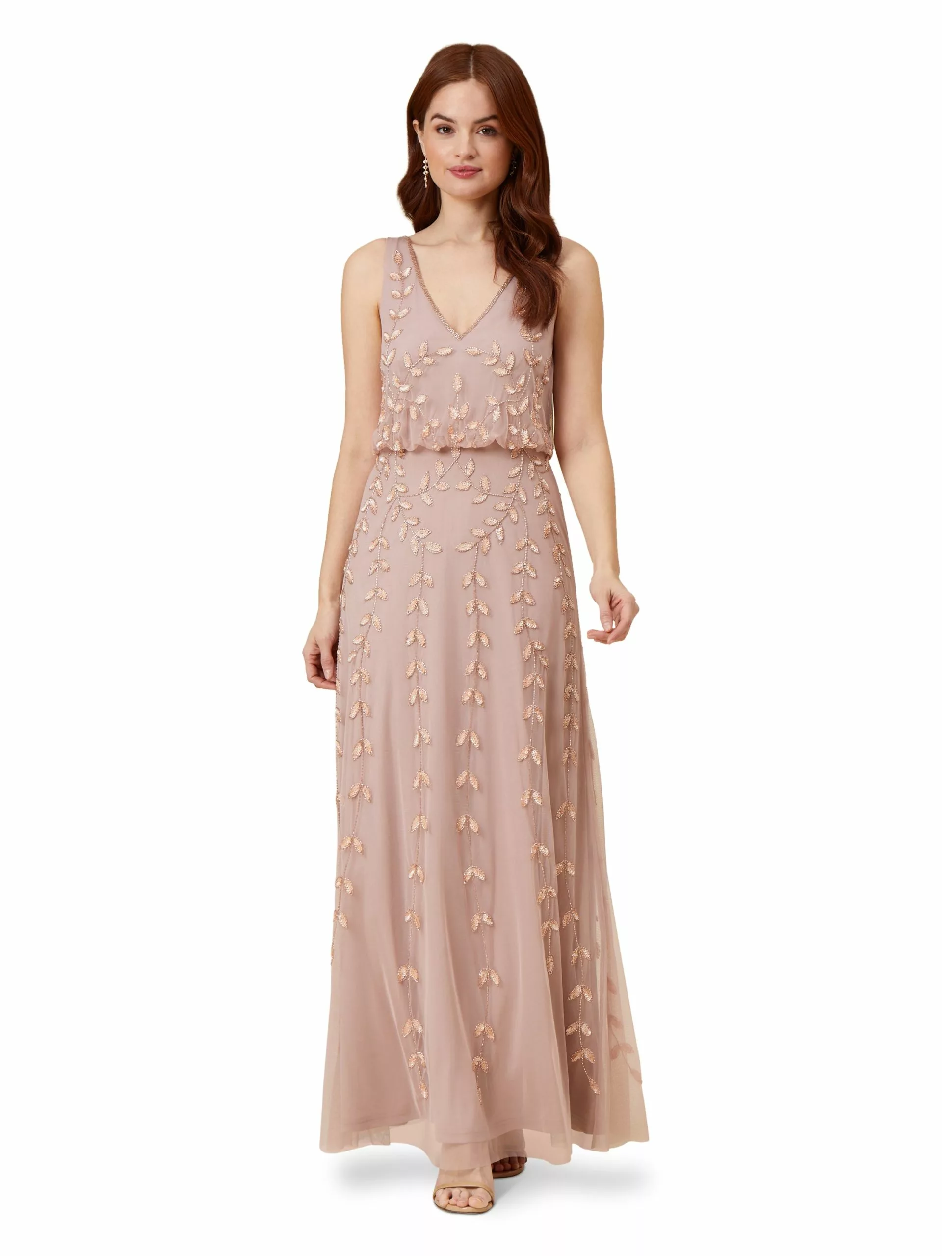 Dress up for the next party or wedding in an elegant way with this Beaded Blouson Gown, featuring a v neck, beaded leaf design, and blouson bodice.