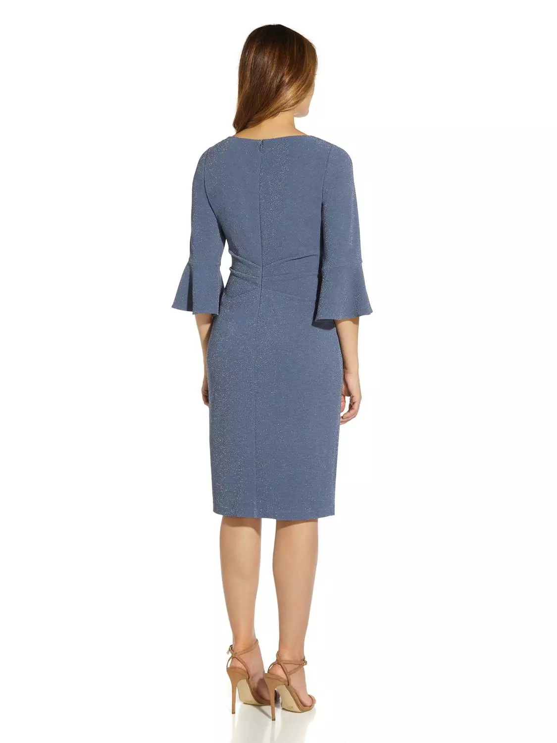 Eye-catching and dramatic, our metallic knit sheath dress is designed to flatter every figure and has a touch of stretch for all day/night comfort. Loving the asymmetrical banded waist and pretty pleats. Details: sleek elbow sleeves with bell cuffs and modern square neckline. Perfect for the office to cocktail hour, bridal shower to wedding receptions.