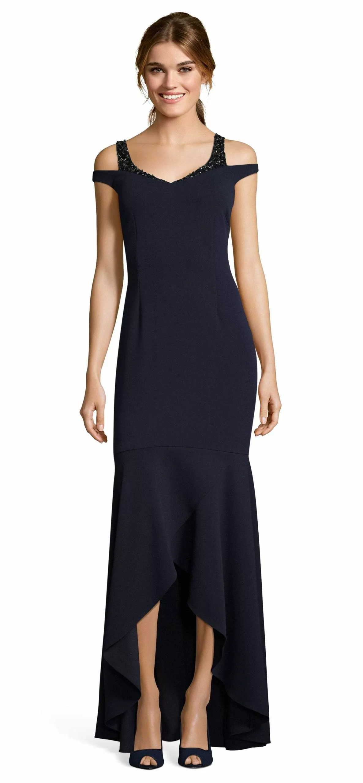 Bead embellishments design the V neckline supported by off-shoulder straps, which forms the cold shoulder cutout detail. This dress presents a trumpet silhouette which cascades to a high low hemline as the reveals a scoop cutout, secured with a center zipper closure detail. Model is wearing Midnight color.