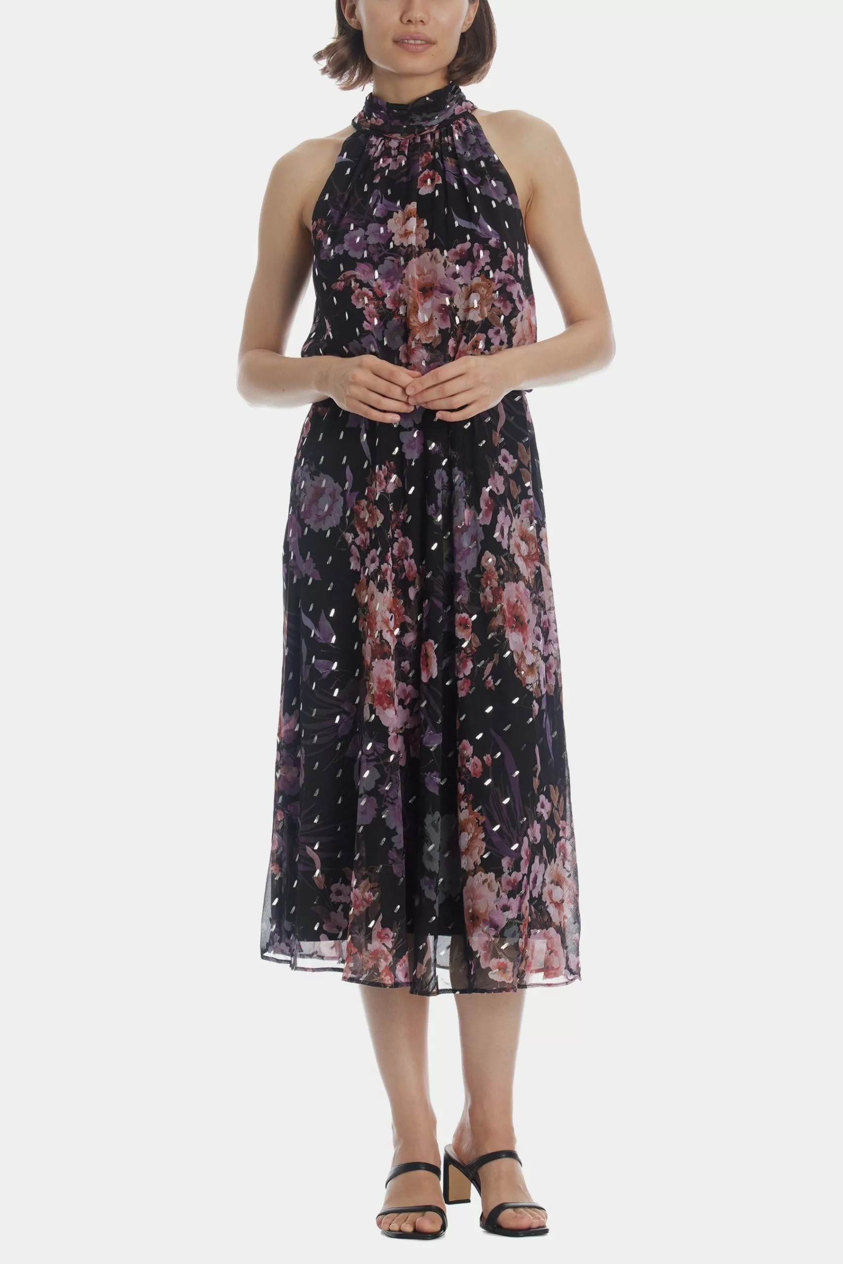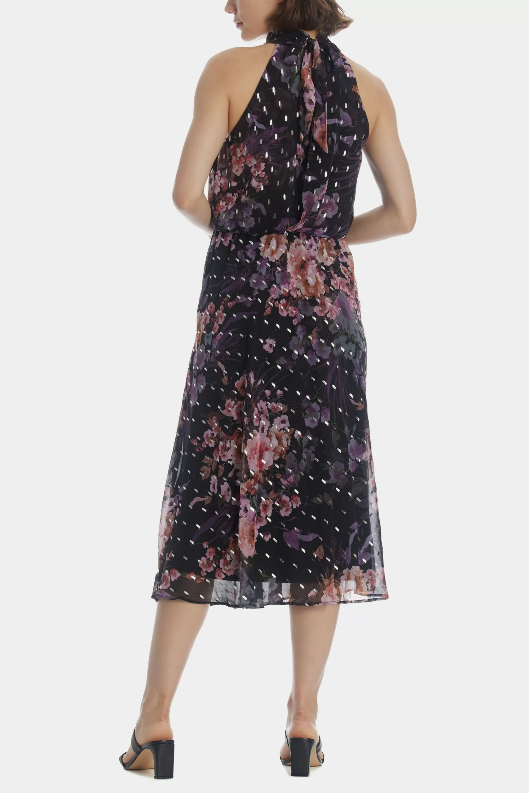 You’ll be the toast of the town in our pull-on dress crafted of a lightweight floral printed foiled chiffon. Designed in our iconic (and super flattering) blouson silhouette, this party ready dress features a gathered mock collar and halter neckline with tie back. Comfortable back elastic waist. The midi skirt is cut on the bias for a beautiful drape.