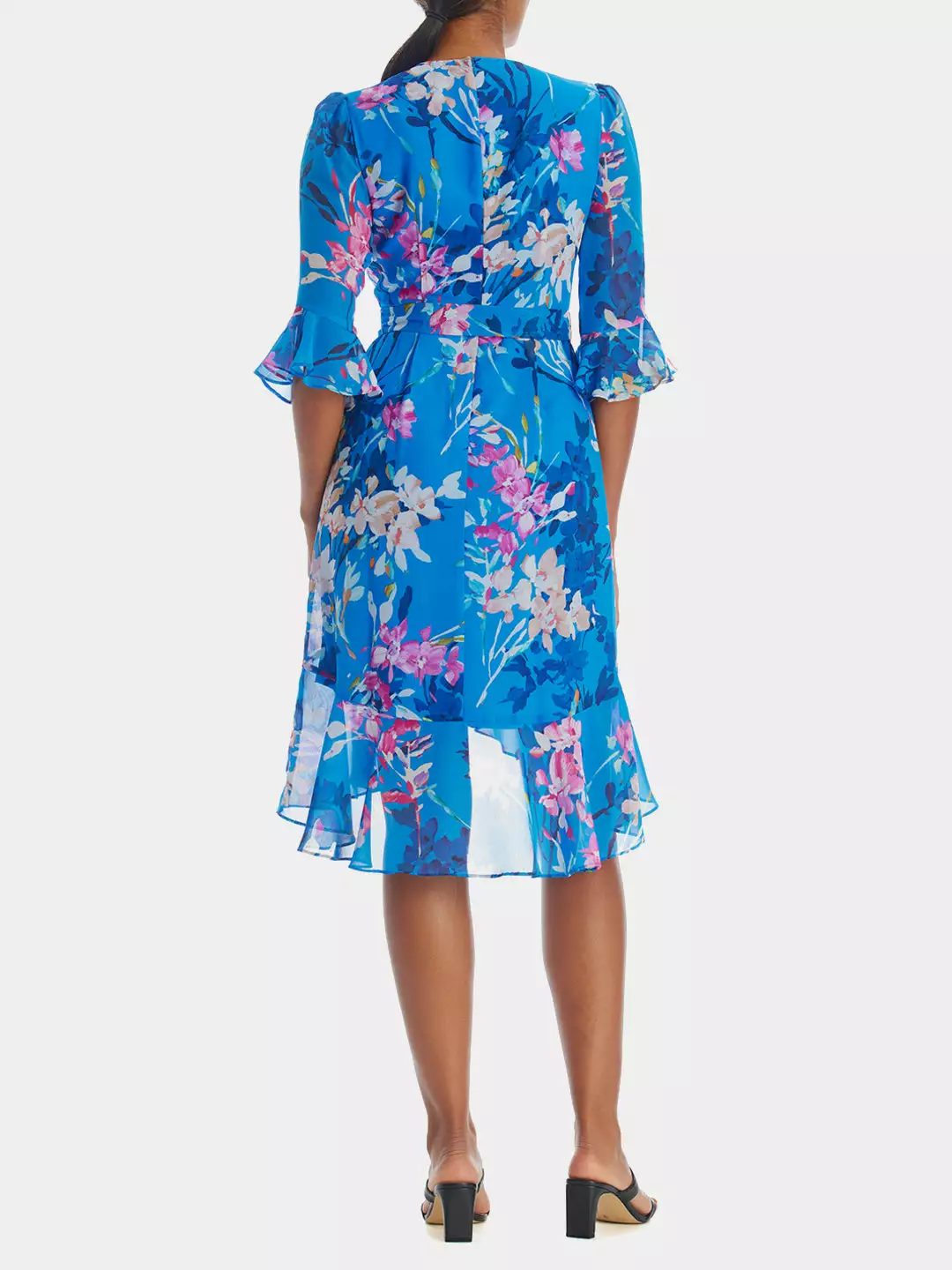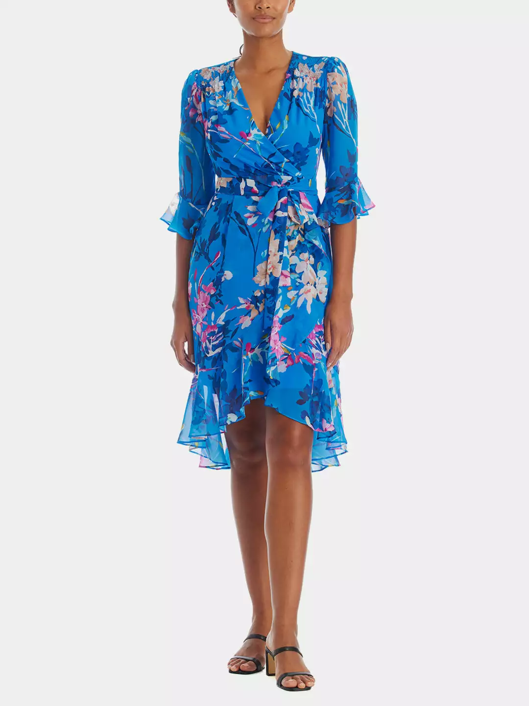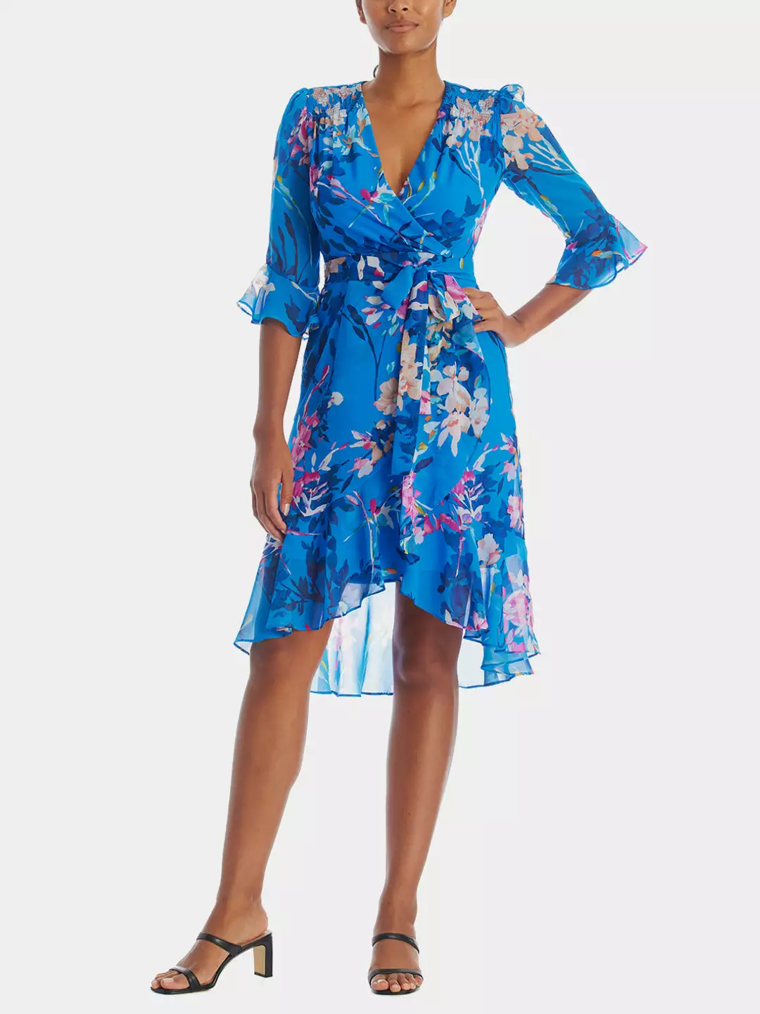 Capture the spotlight with ease in this stunning Floral chiffon wrap dress. Pair it with fabulous heels or wedges.