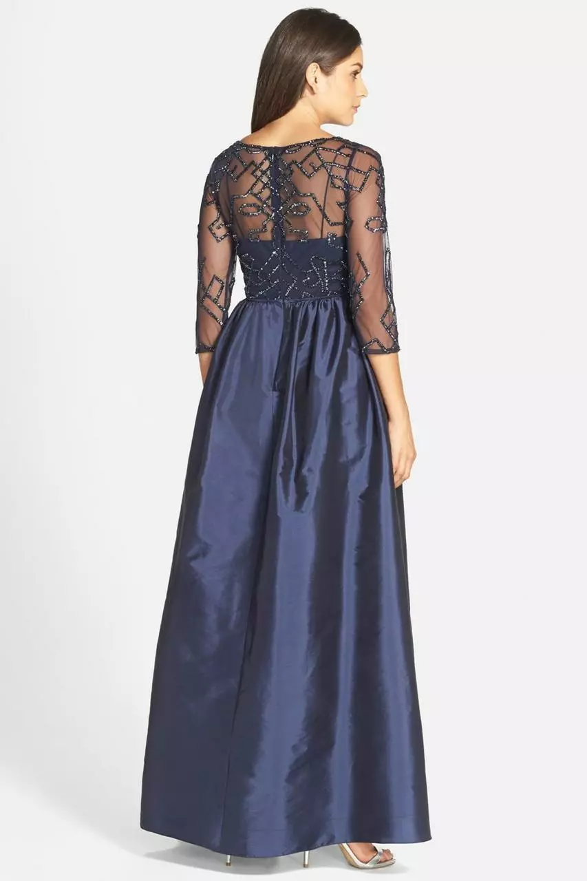 Emanate that sought-after delicate sophisticated look in this intricately ornate Adrianna Papell 91912620 creation. Elaborately embellished with a geometrical beadwork on a mesh fabric, this stunning piece shows a bateau illusion over a sweetheart neckline, sheer quarter sleeves and an alluring full back. Gathered at the waist, the taffeta A-Line skirt blossoms and pleats lavishly down to a full-length hem. Showcase your alluring charms in this dazzling Adrianna Papell creation.