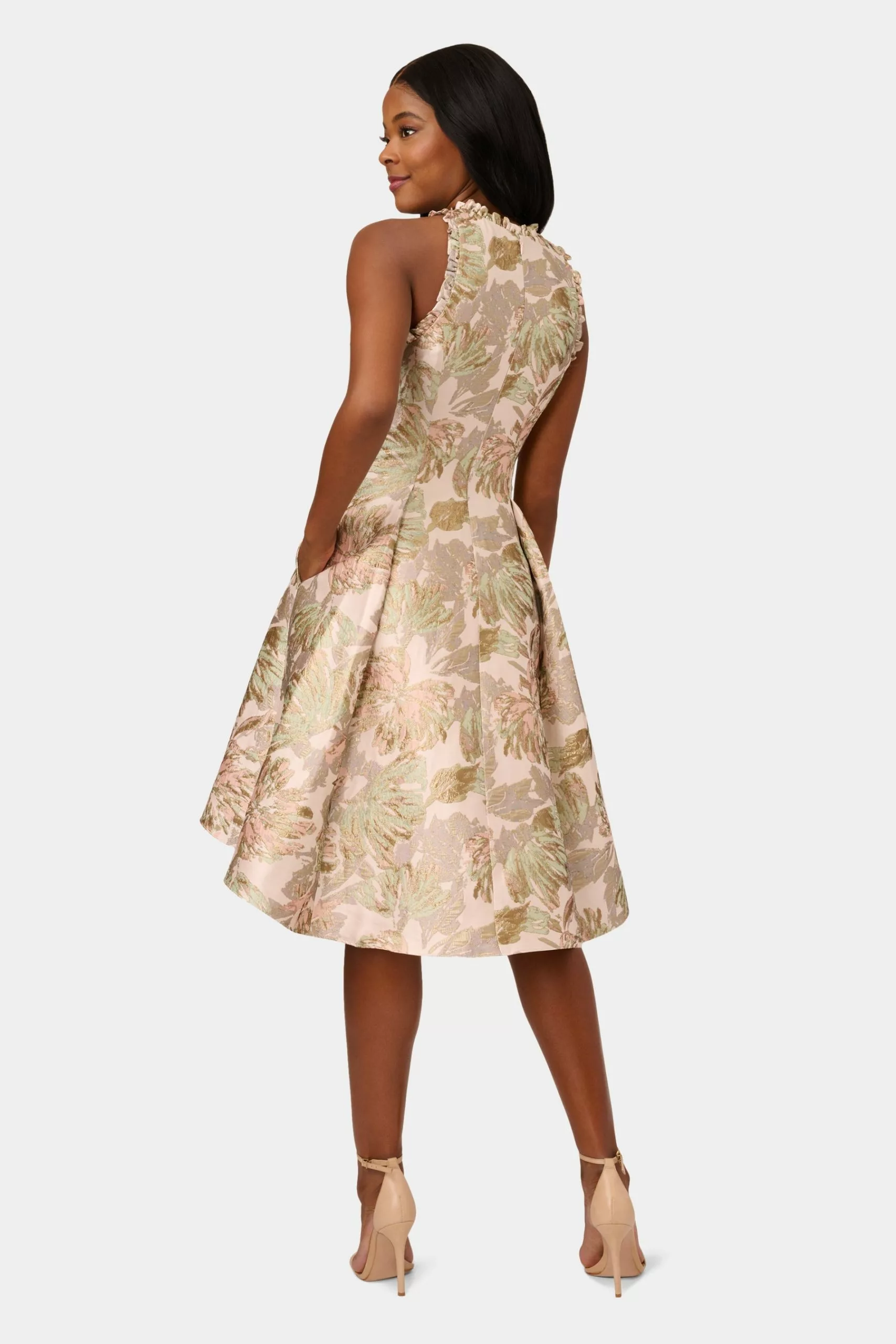 Make a stunning style statement in this Jacquared Flare Dress. Designed in a metallic jacquard fabric, this chic dress has a ruffle accent on the armhole that accentuates its look.